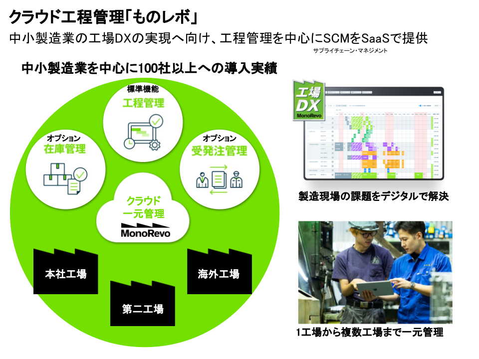 多様化する世界において製造業では少量多品種・短納期の要求が高まっています。しかし、一方で少量多品種・短納期の中小製造業はデジタル技術の習得に苦戦していることも事実です。サプライチェーンプラットフォームの実現に向けた第一歩として、工場の製造現場のデジタル化を推進する工程管理SaaS「ものレボ」を開発し、2019年1月より国内外130社(2022年4月30日時点)の製造現場でご利用いただいています。