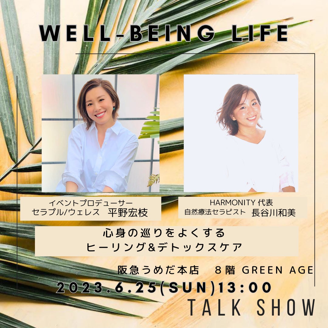 イベントプロデューサー/ウェレス・セラプル 平野宏枝と、自然療法セラピスト/ ハーモニティ長谷川和美の心身の巡りをよくするヒーリング&デトックスケアをトークショーで日々使えるウェルビーイングTIPSをお話します。カリスマセラピストの長谷川和美のデトックスレクチャーを実演でもご紹介します。日々の潤いや癒しにつながるようなお話をする予定です。