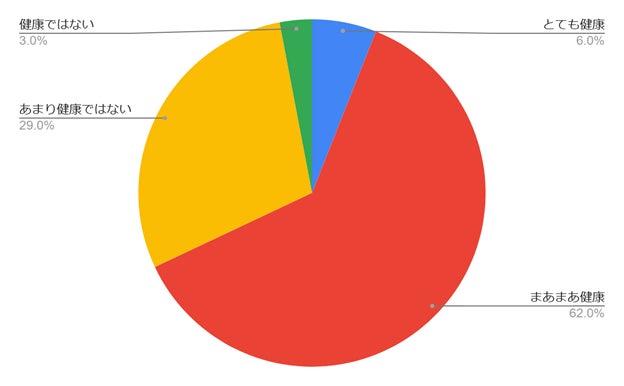 とても健康6%、まあまあ健康62%と、68%がポジティブな回答で、あまり健康ではない29%、健康ではない3%と、32%がネガティブな回答という結果になりました。