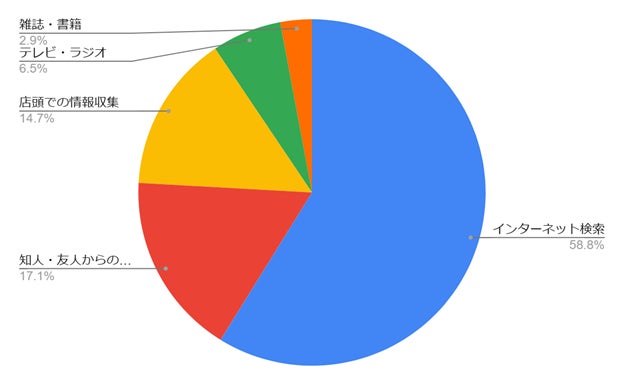 インターネット検索 (58.8%) が最も多く利用されています。知人・友人からの口コミ (17.1%) や店頭での情報収集 (14.7%) も、参考にされています。