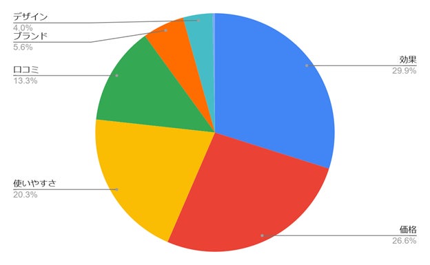 効果 (29.9%) と価格 (26.6%) が重視されています。使いやすさ (20.3%) や口コミ (13.3%) も、購入の決め手となる要素のようです。