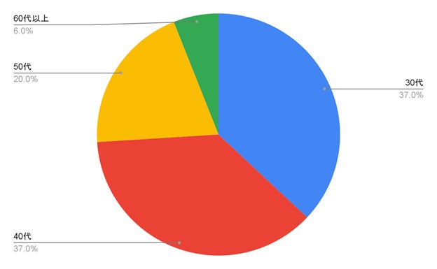 調査対象者の年齢とその割合は、30代が37%、40代が37%、50代が20%、60代が6%となりました。