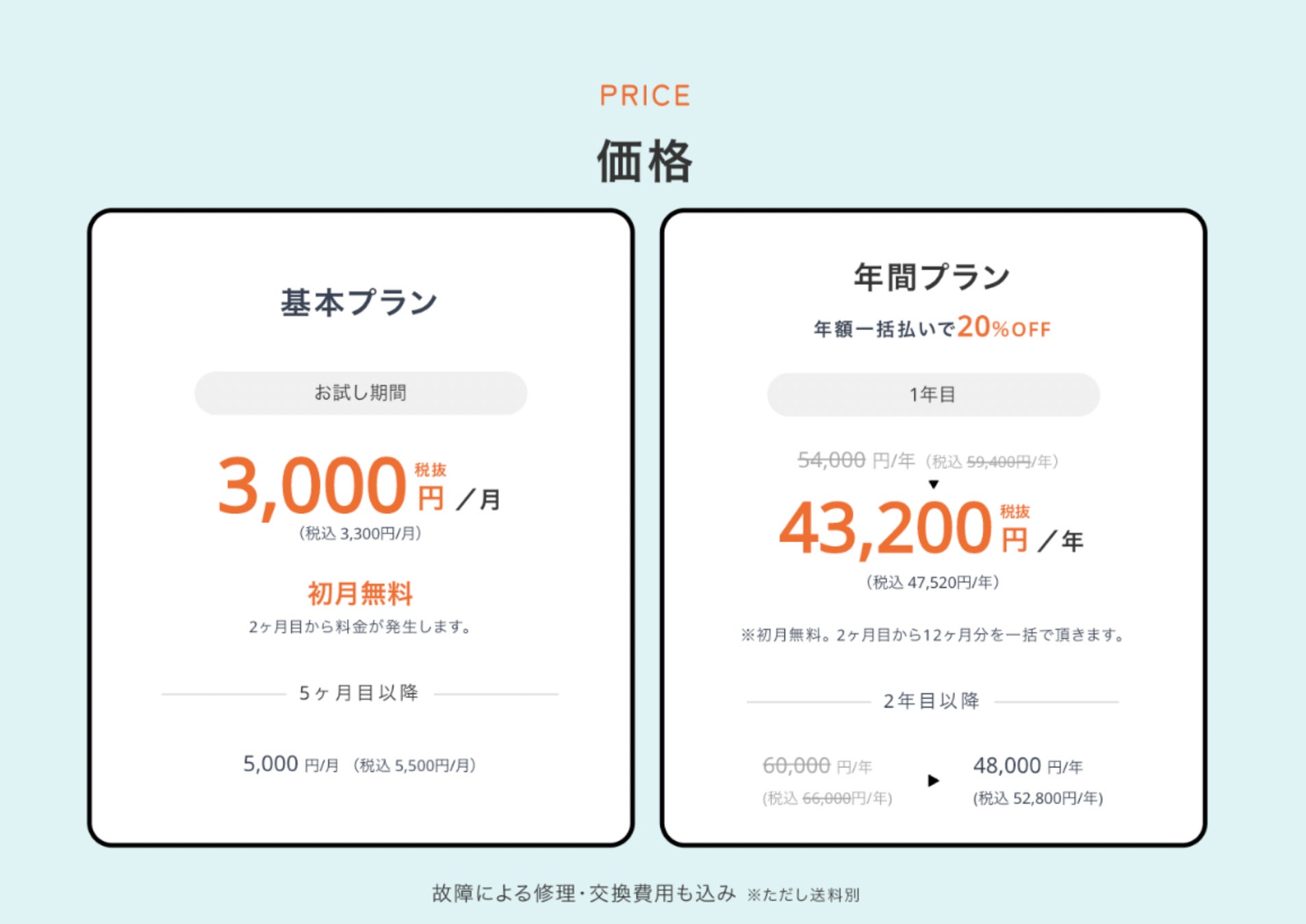 ・販売価格:月額レンタル、故障による修理交換費用込み(送料別)