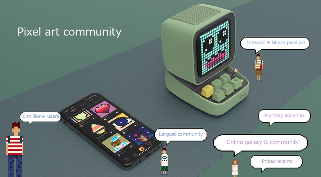 ・専用のスマートフォンアプリケーション『Divoom pixelart community』を使って256灯(16×16)のRGB LEDでオリジナルのピクセルアートのデザイン・アニメーションを作成ができます。(アプリはiOSとAndroidに対応)