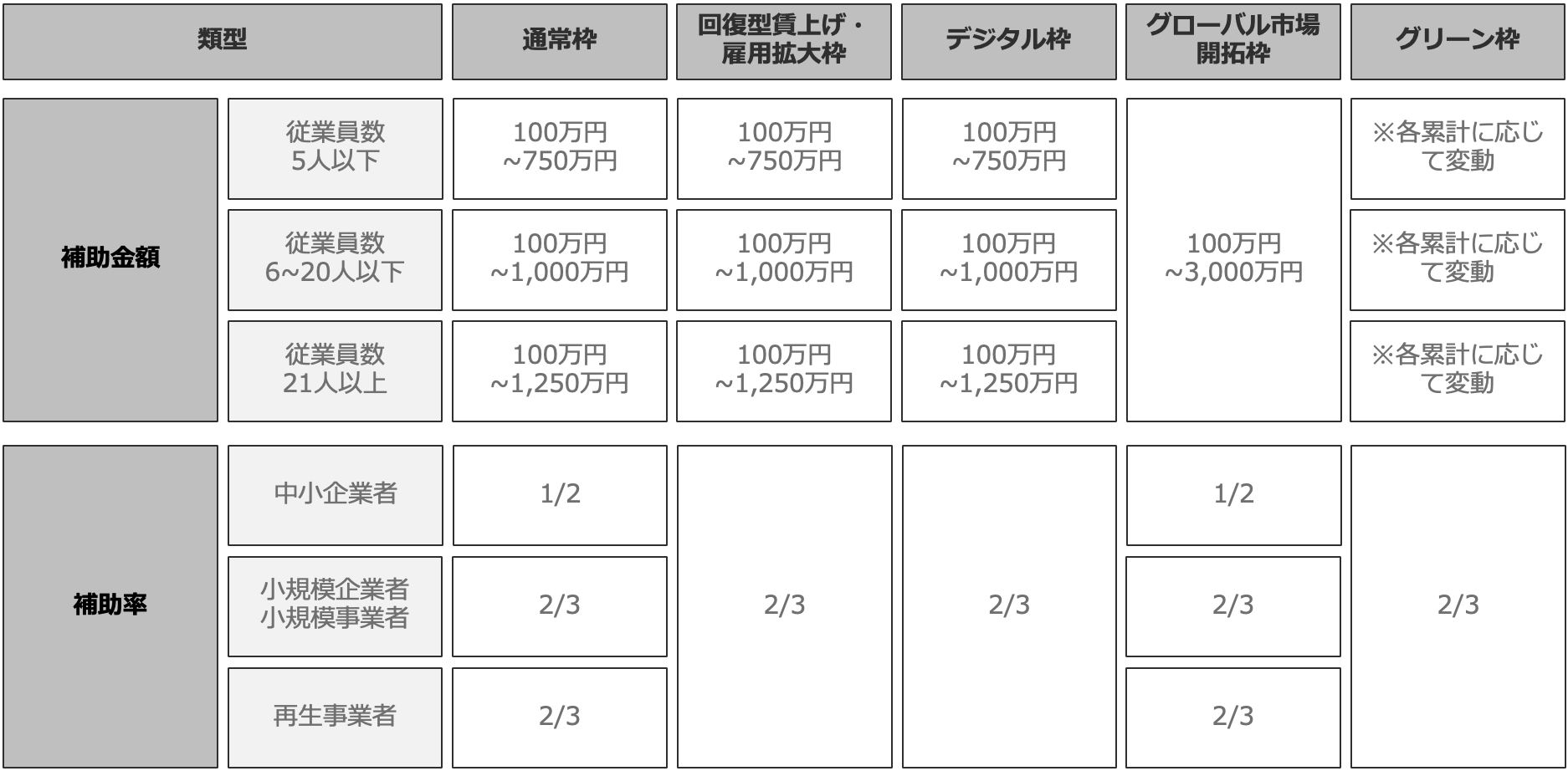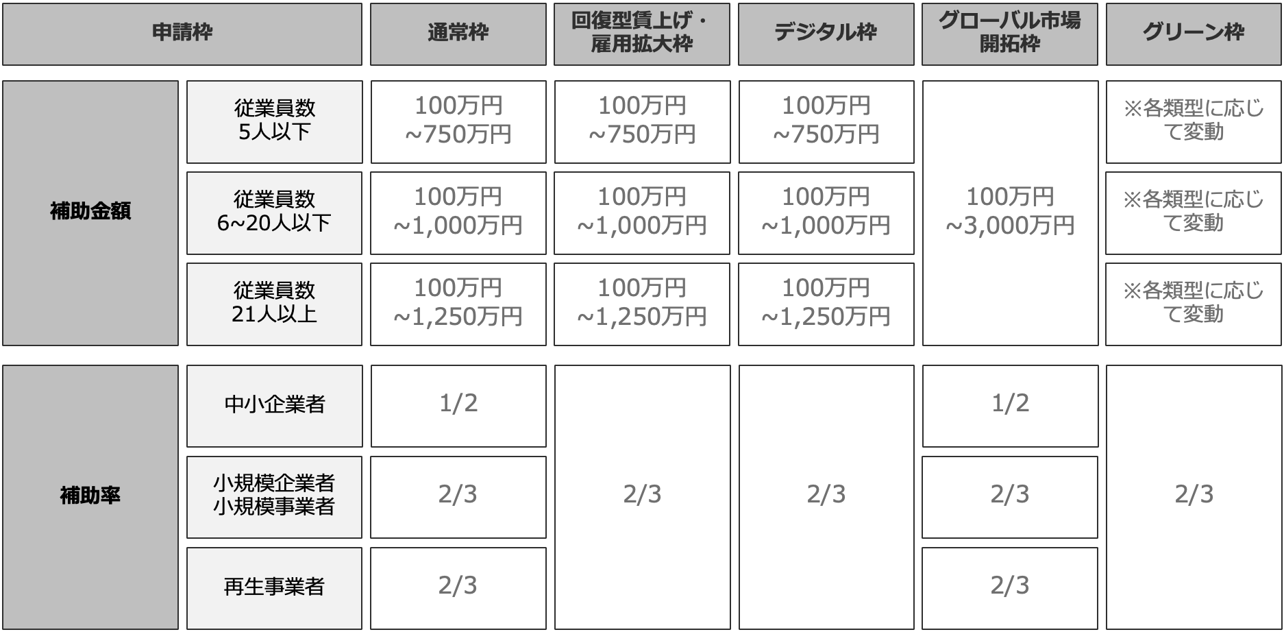 事業者による、「新商品/新サービスの開発提供」「生産/製造プロセスの改善」「サービス提供方法の改善」 を目的として、機械装置やシステム開発などの設備投資を支援する、ものづくり補助金の基本的な申請枠。