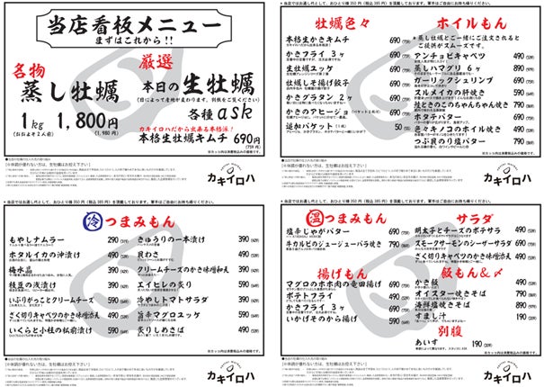 「生がき」は鮮度を重視し、北は北海道、南は九州まで旬な産地から取り寄せるため年中牡蠣を楽しめます。(値段は時期により約480~680円と変動)ポン酢、酒醤油、レモン、フランスのシーソルトをご用意しておりますのでお客様の好みの味でお楽しみいただけます。他にも牡蠣としょうゆなどの調味料を入れ炊いた「かき飯/490円(税込539円)」などを取り揃えております。