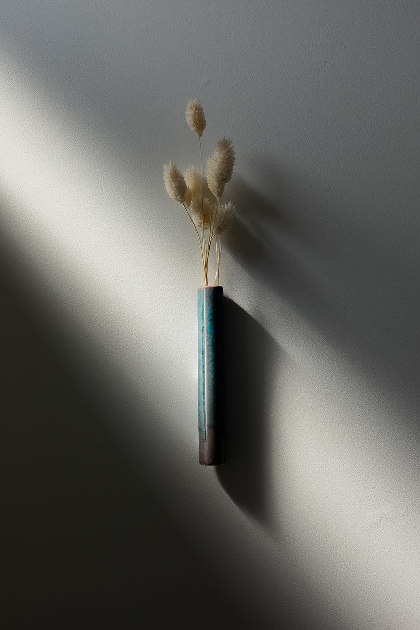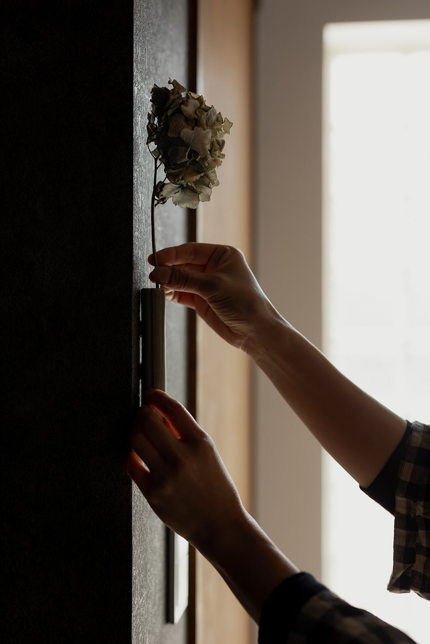 ピン1つだけで、壁に付けることができる一輪挿し「TUKU」。壁にピンをさし、花器(TUKU)をつけ、花を入れるだけで、いつもの壁が明るく華やかな印象に変わります。筒形と丸型の2種類を7色のカラーで展開しています。玄関やリビング、トイレなど、ピンがささる場所であればどこでも設置可能です。ドライフラワーがセットされているので、買ってすぐにお楽しみいただける他、水を入れて生花やグリーンを飾ることも可能です。種類に合わせて専用のギフトボックスをご用意しています。