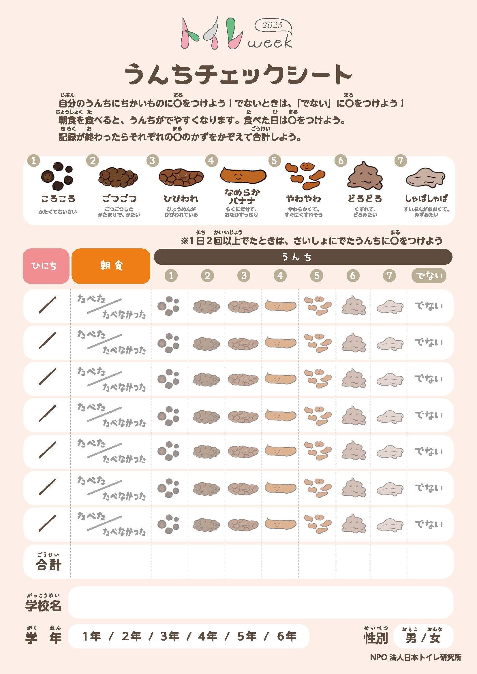 全国の小学校・中学校115校・2万4644人にうんちチェックシートを配布し、トイレweekに合わせて、1週間、排便の有無・便の形状、朝食摂取について記録してもらいます。児童・生徒が体の状態に関心を持ち、健康管理ができるようになること、排便状態の実態を把握することが目的です。