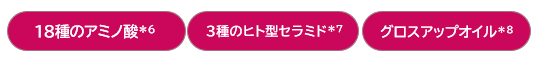*1当社内における独自原料 *2アミノホスホノ酪酸アルギニン、マレイン酸、レブリン酸(保湿・補修成分) *3BP SDプレトリートメント、シャンプー、ヘアトリートメント(ヘマチン、ポリクオタニウム-47、ポリクオタニウム-53、ポリクオタニウム-61(補修成分))、BP SDヘアミルク、ヘアオイル(ヘマチン、サルビアヒスパニカ種子油、シア脂、カミツレ花エキス、イヌラクリスモイデ花/葉エキス(補修成分)) *4ステアルジモニウムヒドロキシプロピル加水分解ケラチン(羊毛)(補修成分) *5当社比(シリーズ使いによる) *6シスチン、グルタミン酸、ロイシン、アルギニン酸、セリン、アスパラギン酸、スレオニン酸、プロリン、グリシン、チロシン、バリン、アラニン、フェニールアラニン、リシン、メチオニン、トリプトファン、ヒスチシン、ヒドロキシプリンボンドプレックス(補修成分) *7セラミドNG、セラミドNP、セラミドAP(保湿成分)*8ツバキ種子油、オリーブオイル、アルガンオイル、ホホバオイル(保湿成分) *9ボンドプレックスストレート&カラーケアシリーズを使ったステップケアのこと