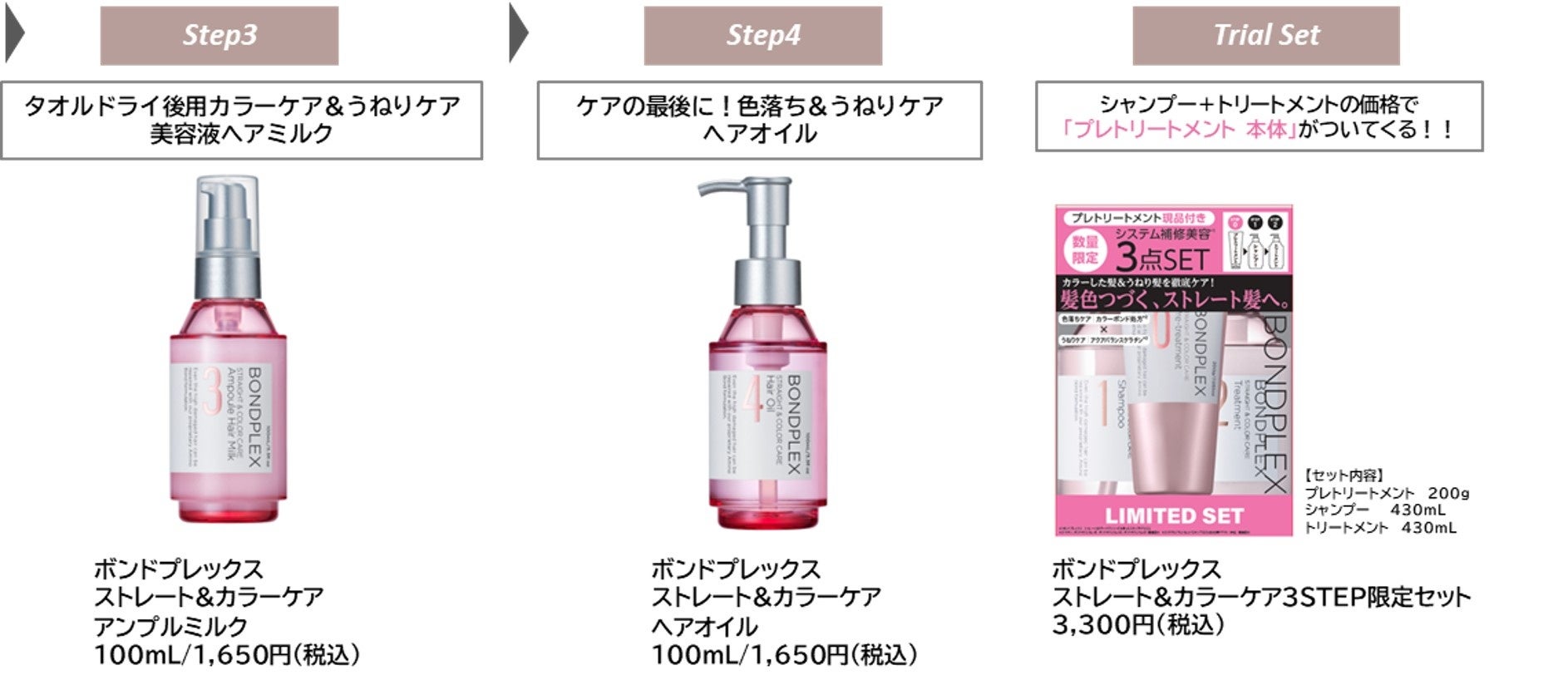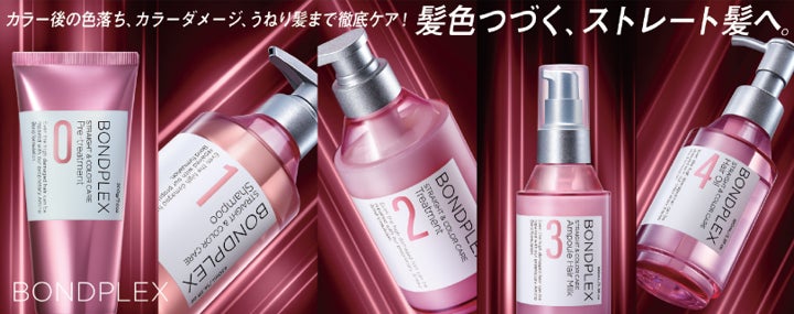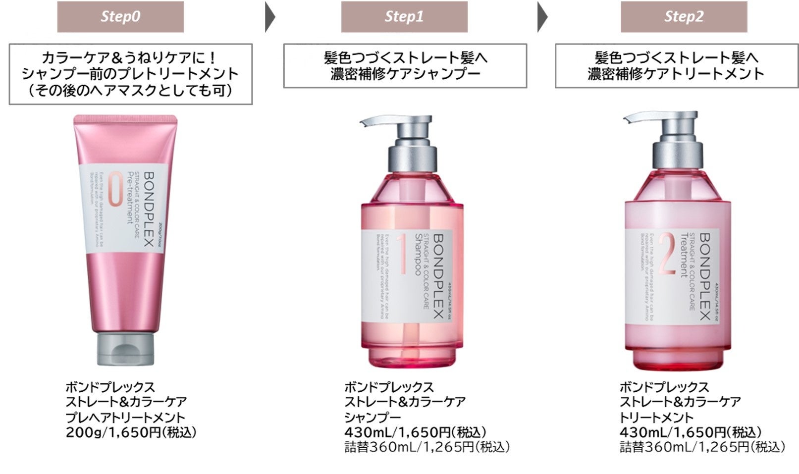 その第2弾として、カラーをキープし、うねり・くせをストレート髪へと導く「ボンドプレックス ストレート&カラーケア」シリーズを発売致します。