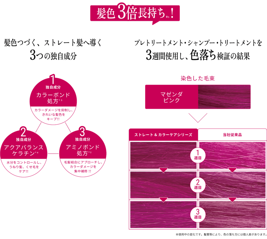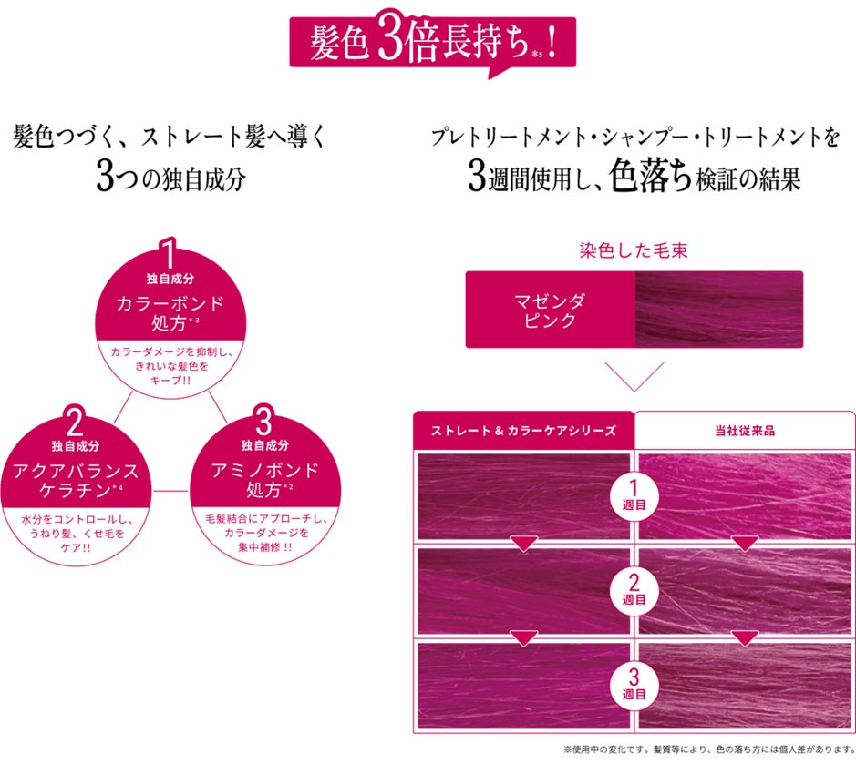 ヘアカラーをキープし、ストレートヘアへ整える 3つの独自成分配合