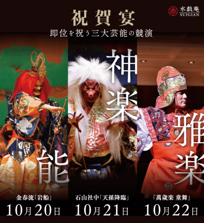 即位の日の前前夜、前夜にあたる20日、21日は、日本の古典「万葉集」、「古事記」に所以する演目である、「岩船」「天孫降臨(てんそんこうりん)」を。即位の儀当日にあたる、22日は、宮家の式典を彩る「雅楽」の調べと共に、優雅な舞楽で、令和の幕開けを祝いの宴を愉しんでいただく事のできる3日間なっております。