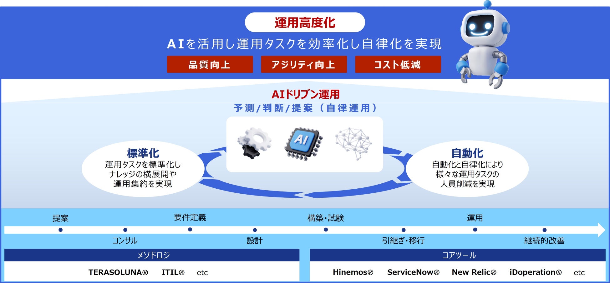 「Hinemos」や「ServiceNow」などの運用コアツールの提供に加え、これまでNTTデータ先端技術が培ってきた技術スキル、ITILなどの運用メソドロジをベースに、提案からサービス開始後の継続的改善までの全工程を網羅したサービスを提供します。各サービスは生成AIを活用し運用担当者の負担軽減と属人化の排除により、運用の標準化や自動化に加えて運用の高度化も行います。