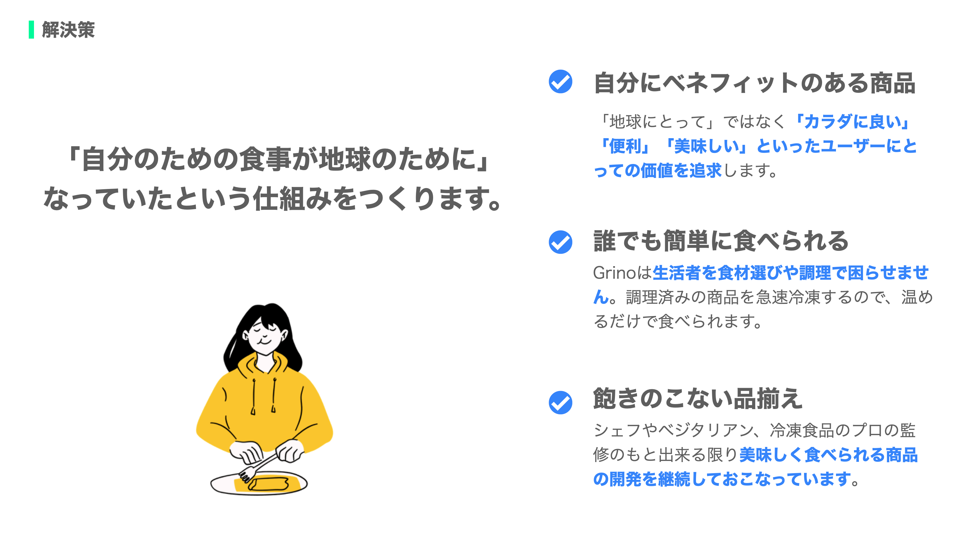 Grinoは「自分のための食事が地球のためになる仕組み」をつくります。Grinoを選んでくださるユーザーの方々はご自分の健康のため、忙しい生活を少しでも楽にするため、美味しいと思える食事をするために選んでいただきたいと考えます。
