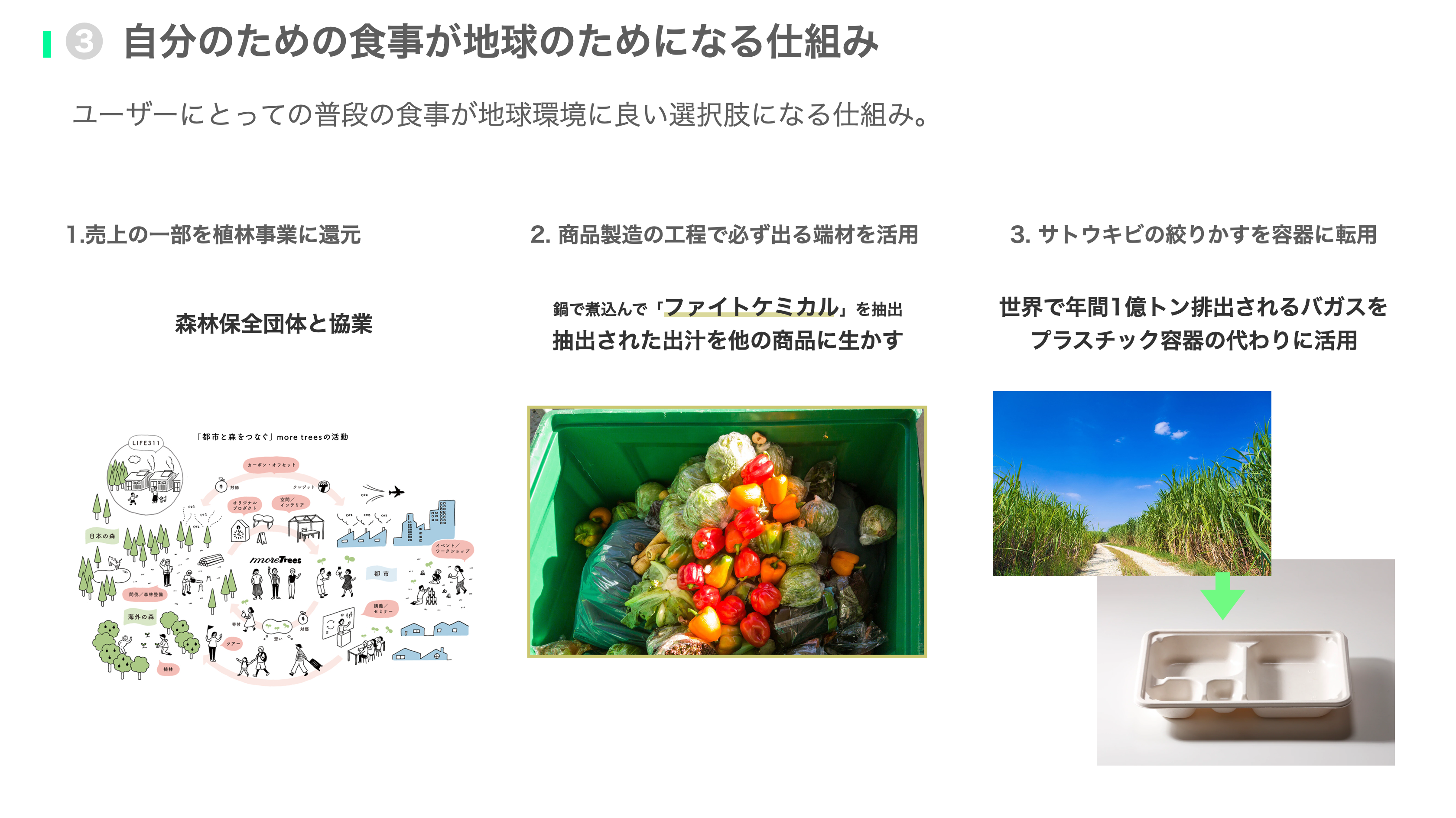 「自分のための食事が地球のためになる」食事で次の世代により良い地球環境を残すことを目指します。