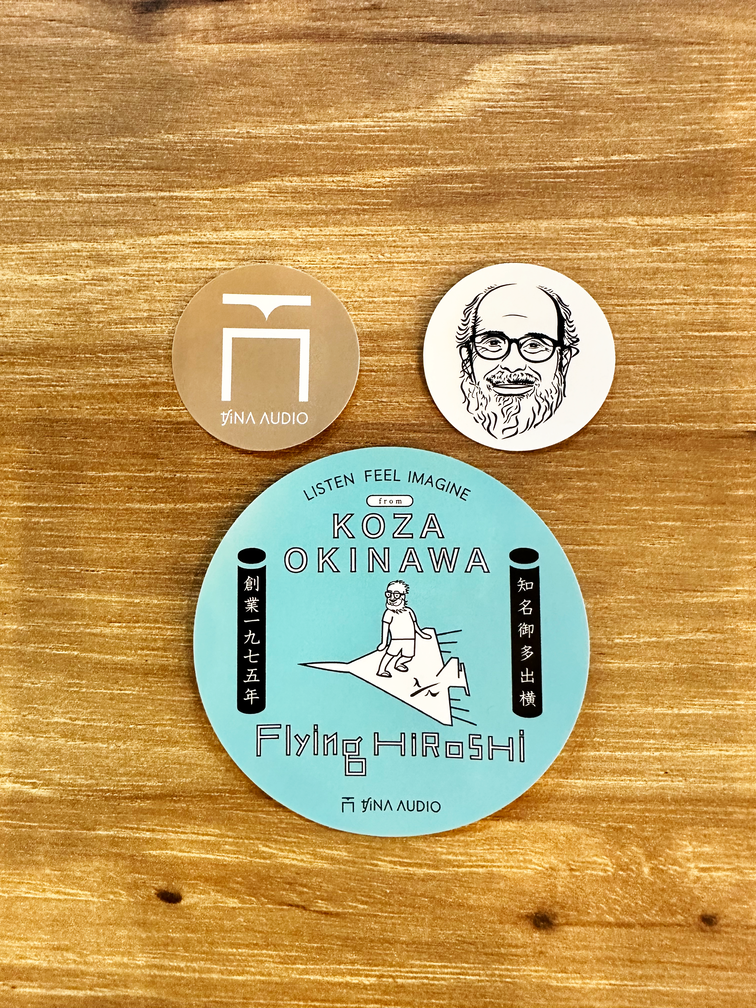 ロゴマーク、『Flying HIROSHI』、「知名 宏師」似顔絵イラストのステッカーが1枚ずつ入った、ステッカーセットです。スマホや手帳など、お気に入りのものに貼り、知名オーディオを身近に感じていただけると嬉しいです。