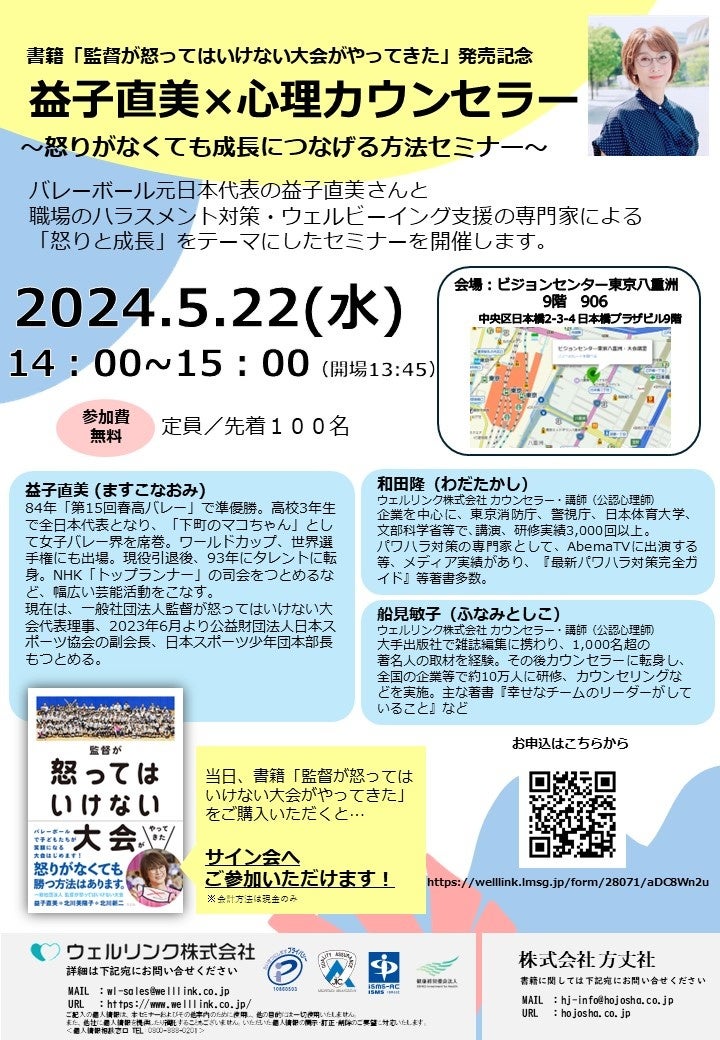 書籍「監督が怒ってはいけない大会がやってきた」の発売を記念したバレーボール元日本代表の益子直美さんと職場のハラスメント対策・ウェルビーイング支援の専門家による「怒りと成長」をテーマにしたセミナーです。
