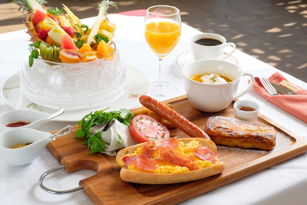 大自然の澄んだ空気と、フェアウェイから昇る朝日を眺めながら淹れたてのコーヒーを堪能できる。朝食はレストランのテラス席をご用意。