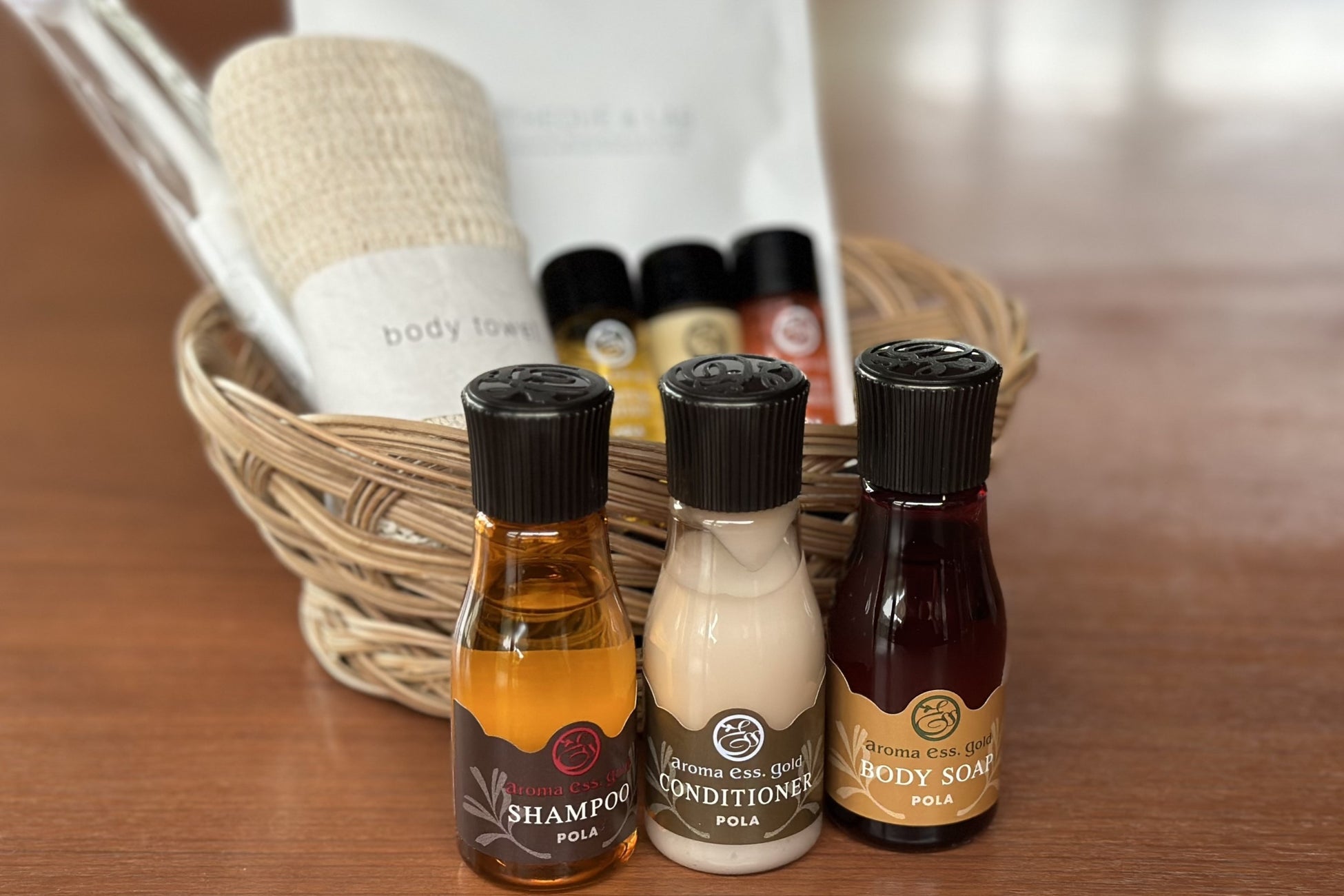 専用のアメニティセット( シャンプー、コンディショナー、トリートメント、ボディーソープ、歯磨きセット、コットン)をご用意。