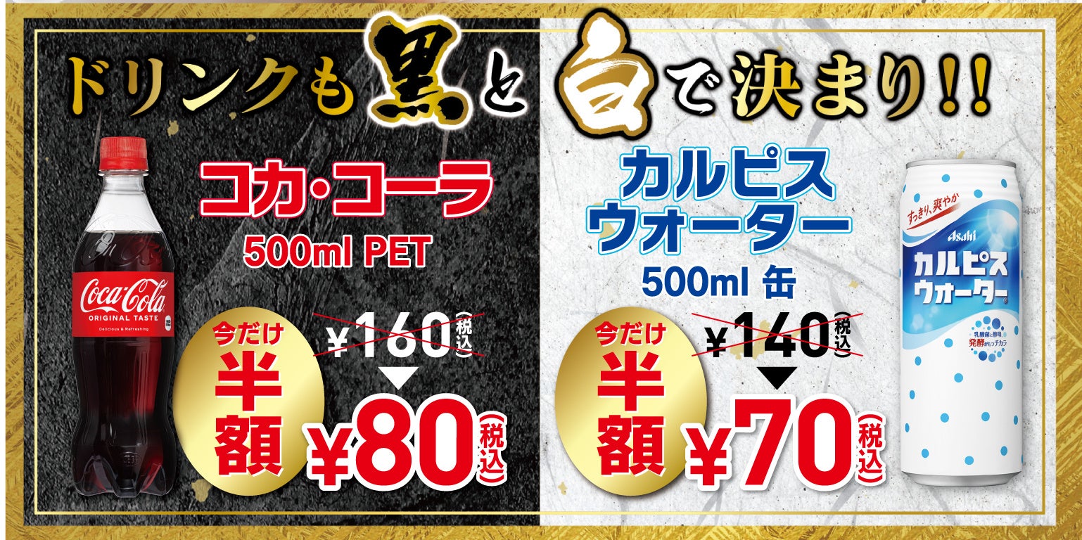 本キャンペーン期間、コカ・コーラ500mlペットとカルピスウォーター500ml缶を半額キャンペーン!ドリンクも「黒と白」でピザと一緒にどうぞ。