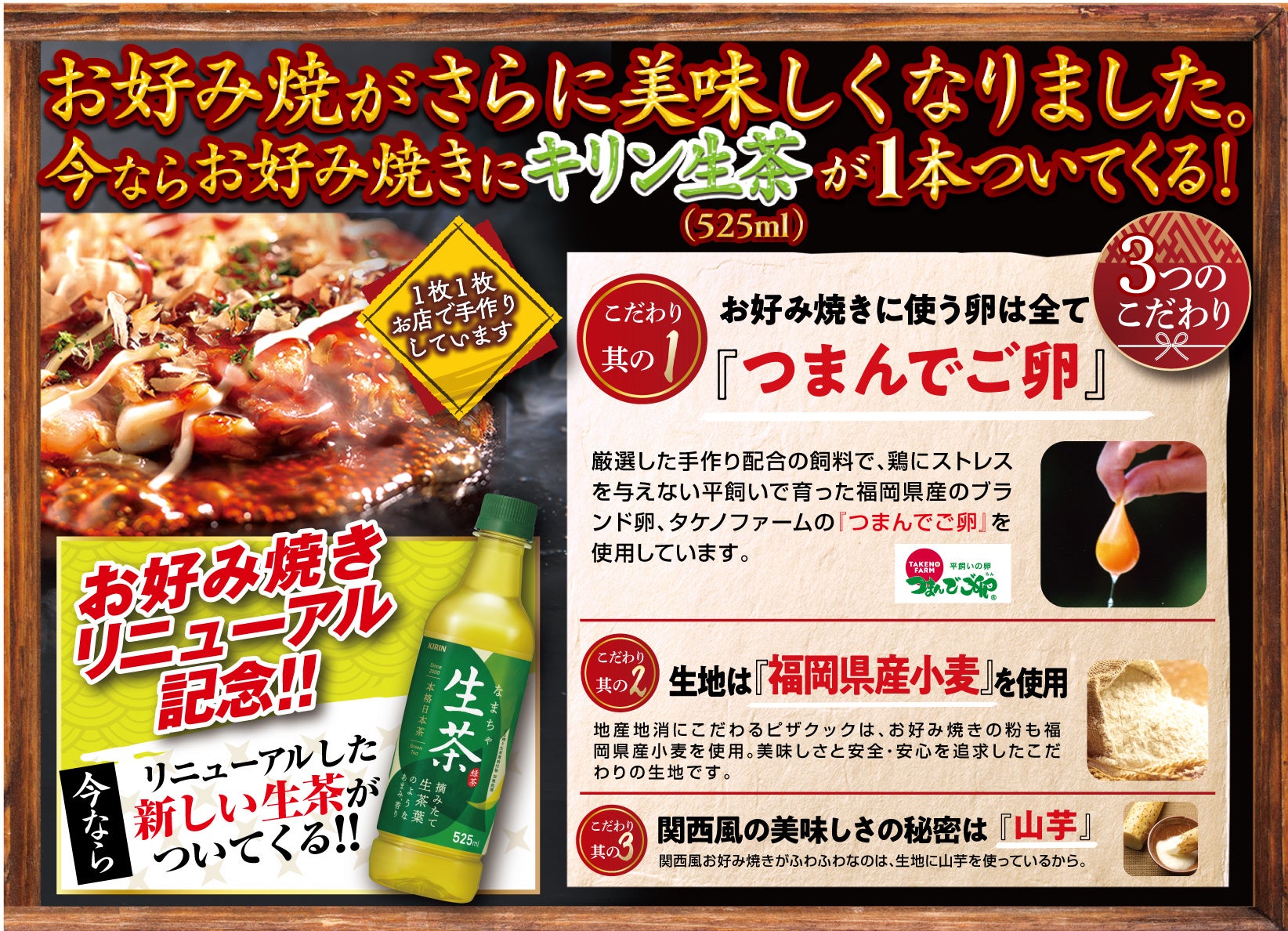 リニューアル記念でお好み焼き全品のいずれかをご注文頂くと、キリン生茶が1本ついてくる!