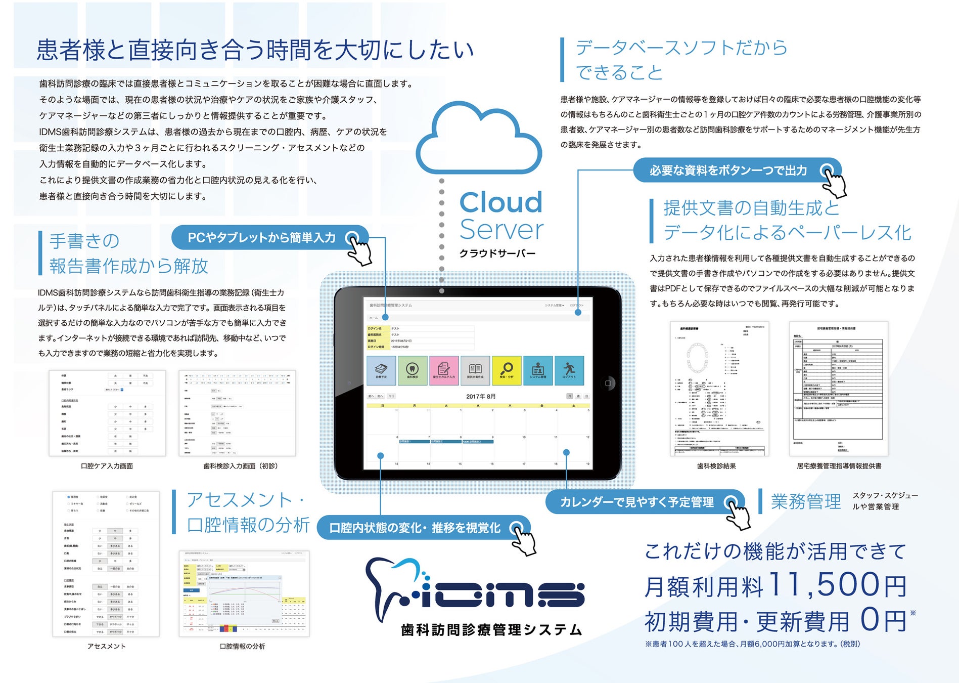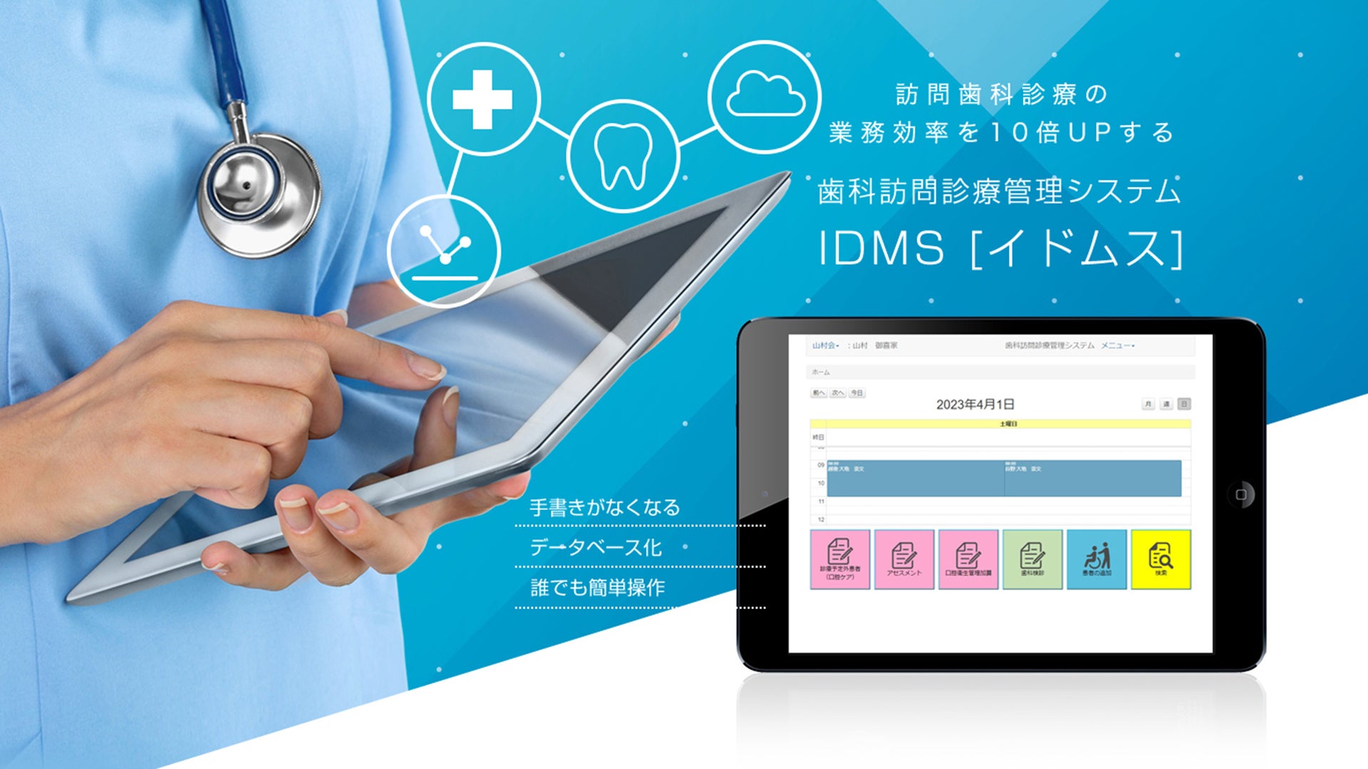 株式会社イドムス(神奈川県海老名市)は2018年よりクラウドサービスを開始した、歯科訪問診療管理システム「I D M S」をユーザーである歯科医師・歯科衛生士の声を反映し、歯科訪問診療の日常臨床において必要なデータの蓄積・分析や、誰でも直感的に入力操作できるように大幅アップデートを行いました。