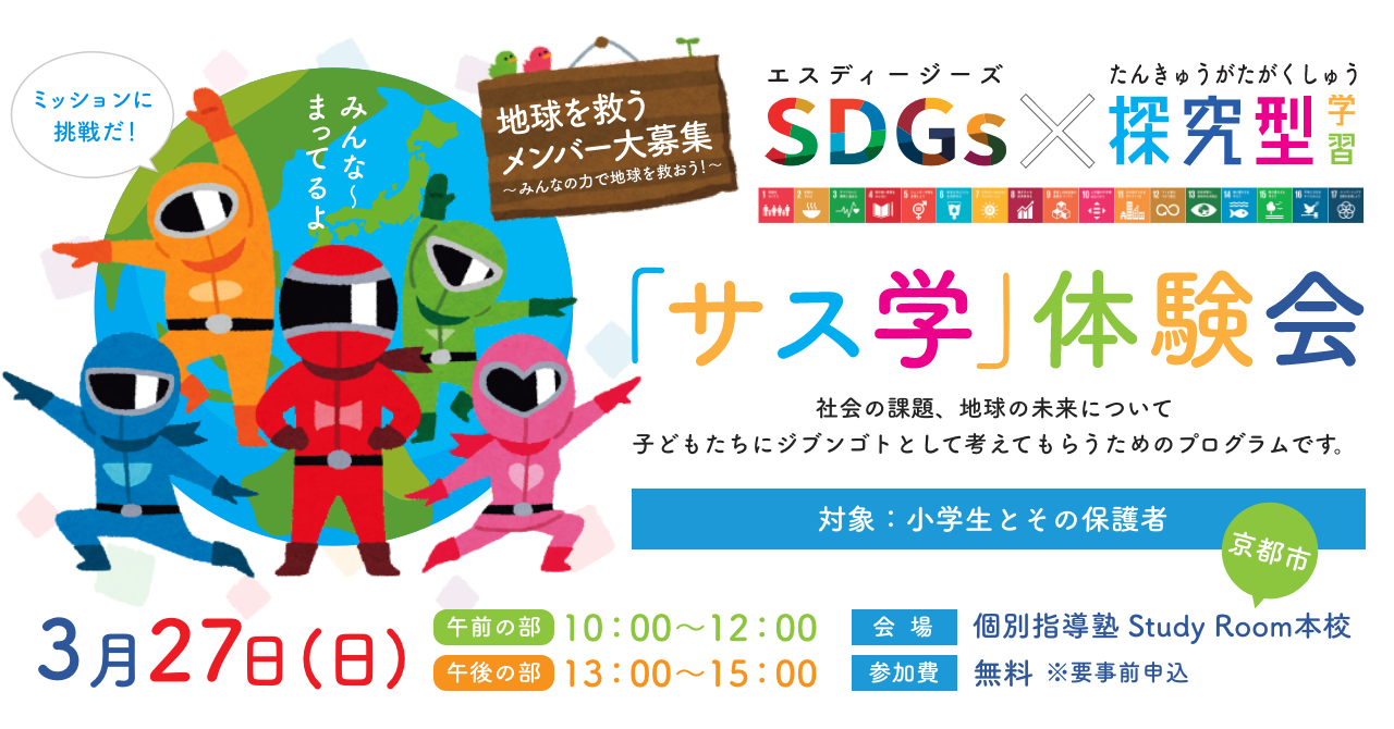 株式会社ジェイシー教育研究所は2022年3月27日、京都市左京区「個別指導塾 Study Room」にて、SDGs×探究型学習「サス学」体験会を開催いたします。