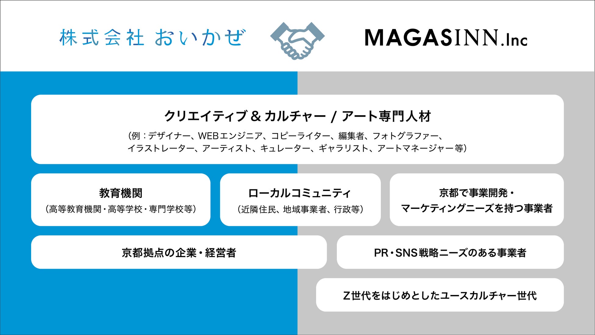 またおいかぜの常駐エンジニアリング業務などで培った組織力、そして京都の地場企業・経営者のリアリティや知見と、マガザンの持つ個の創造的なエネルギーやデジタル世代に向けた事業展開の実績やリソースの融合・コラボレーションにより、京都に多く存在するクリエイティブ&アート人材のビジネス領域での活躍の場を増やし、地域文化資源のコミュニティ発展に寄与することができると考えております。