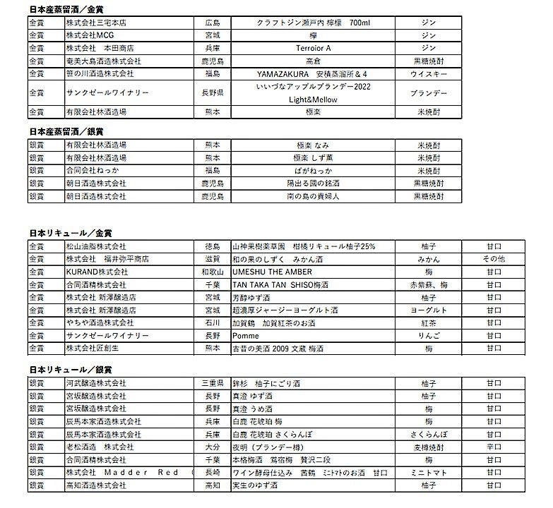 2019年:日本産リキュールを含め、31社65アイテムが出品、うち21アイテムが金賞入賞。