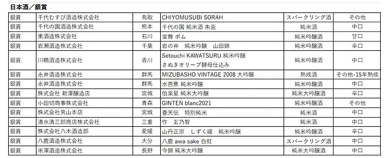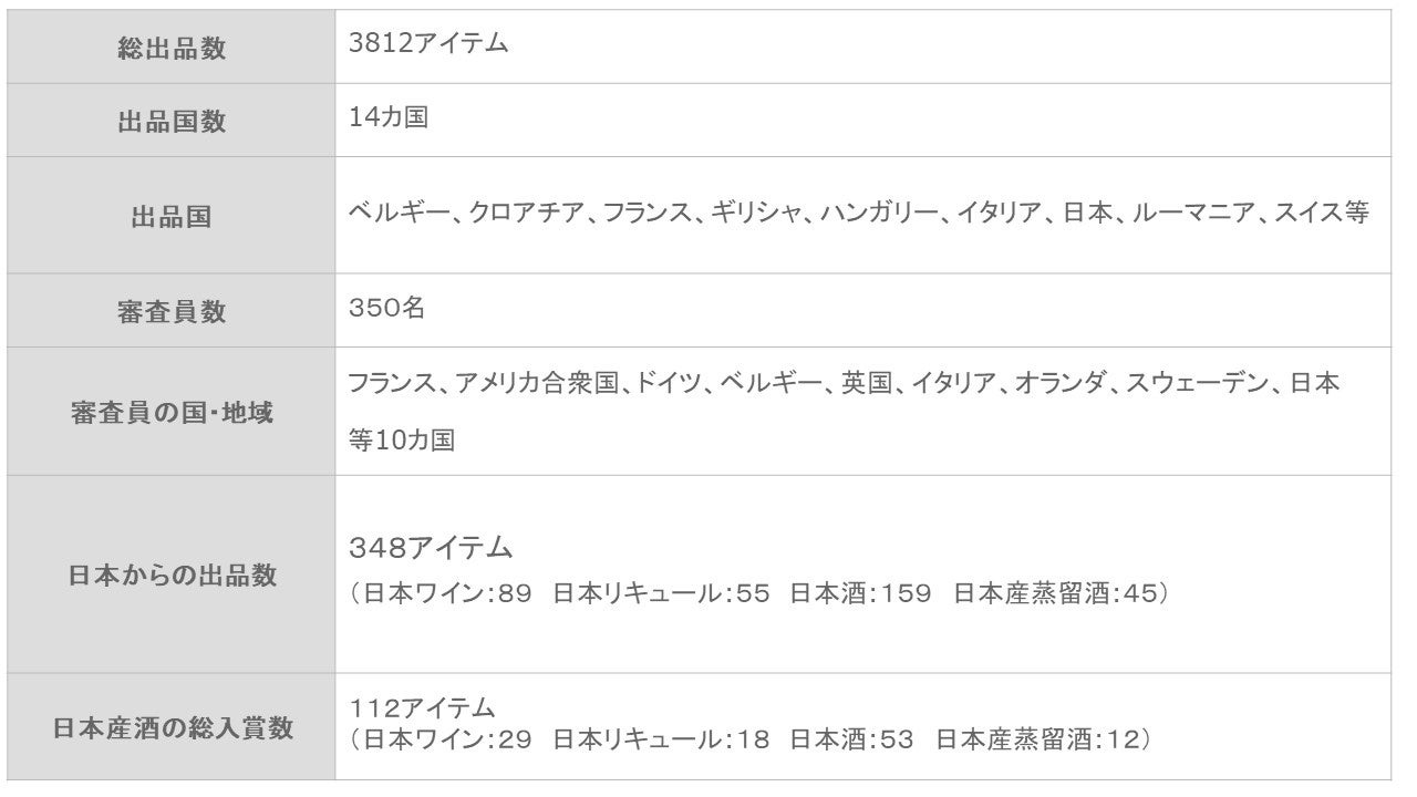 2020年:世界から4470アイテムの出品。日本からは176アイテム出品。うち日本ワインが50アイテム(赤21アイテム、白25アイテム、スパークリング4アイテム)、日本リキュールが30アイテムの出品。同年から増設された「日本酒部門」には、96アイテムの出品(うち純米大吟酒31、純米吟醸酒23、純米酒23、熟成酒7、スパークリン酒12)。