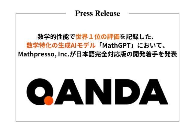 2024年3月29日、アジア最大のAIベース学習プラットフォームQANDAの運営会社であるMathpresso社は、数学的性能で世界1位の評価を記録した、数学特化の生成AIモデル「MathGPT」において、日本語完全対応版の開発着手を発表した。Mathpresso社は、Google、TikTok、ソフトバンクベンチャーズアジアとの資本提携を結び、50カ国以上で9000万人以上の登録ユーザーを集めるグローバルEdTech企業である。日本では、Mathpresso社の運営する質問応対サービス「QANDA」がアプリダウンロード数で学習アプリ部門、第1位を獲得するなど、中学・高校生の学習アプリとして定着している。今後、既に提携を進めている日本の教育企業をパートナーとして、この世界最高評価の数学特化の生成AIモデル「MathGPT」を核としたサービスを展開する方針である。