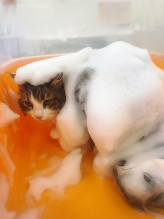 さらに特筆すべきは身体が濡れることを嫌がる猫に対して、使用する水が少なく泡で優しく包み込むラテスパは、リライフアニマルクリニックにて多くの猫のシャンプーを可能にしてきました。