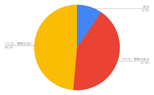 調査によると、美容医療(美肌治療)を受けたことがある方は9.5%にとどまりました。しかし、41.9%の方はまだ受けたことがないものの、興味を持っていると回答したことから、半数以上の方が「美容医療(美肌治療)」に興味があることがあるということができます。一方、48.6%の方は美容医療に対する興味はないとのことです。