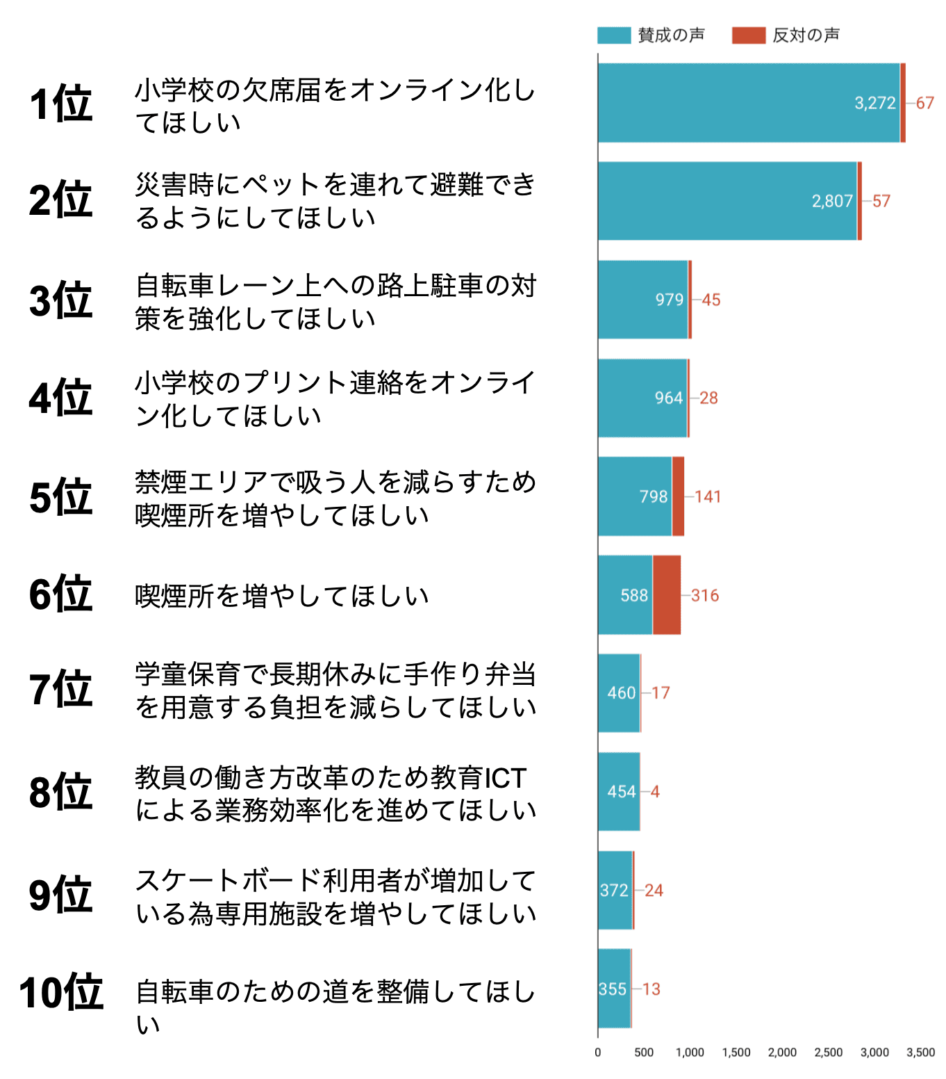 小学校と家庭の連絡オンライン化、災害時にペットと一緒に避難したい、自転車レーンの整備、喫煙所の増設などの要望が上位に