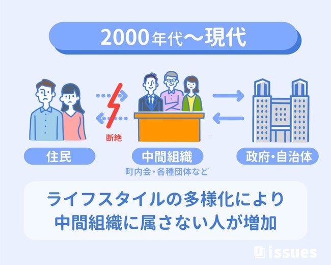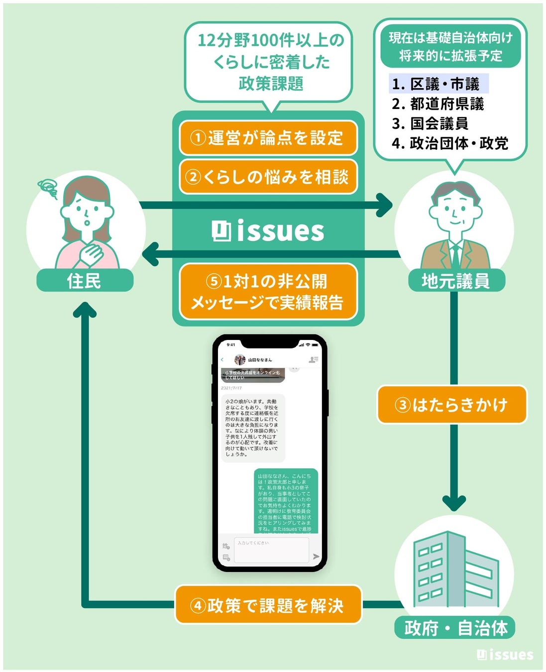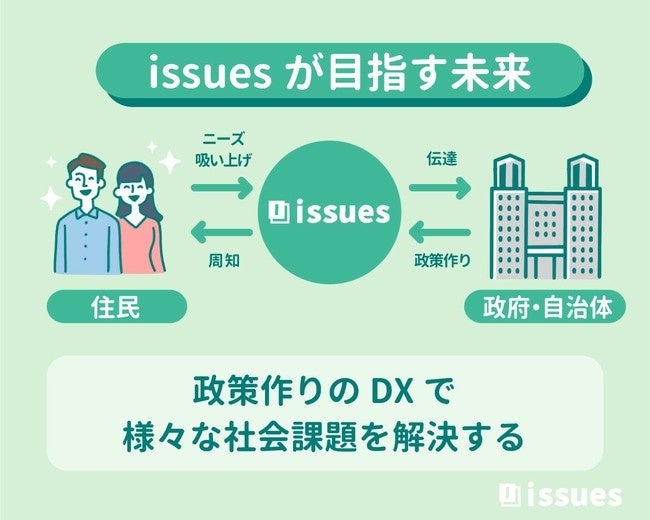 私たちissuesはこの失われた住民ニーズの把握や政策の周知機能をデジタルの力で再構築し、様々な社会課題を解決するインフラとなることを目指しています。