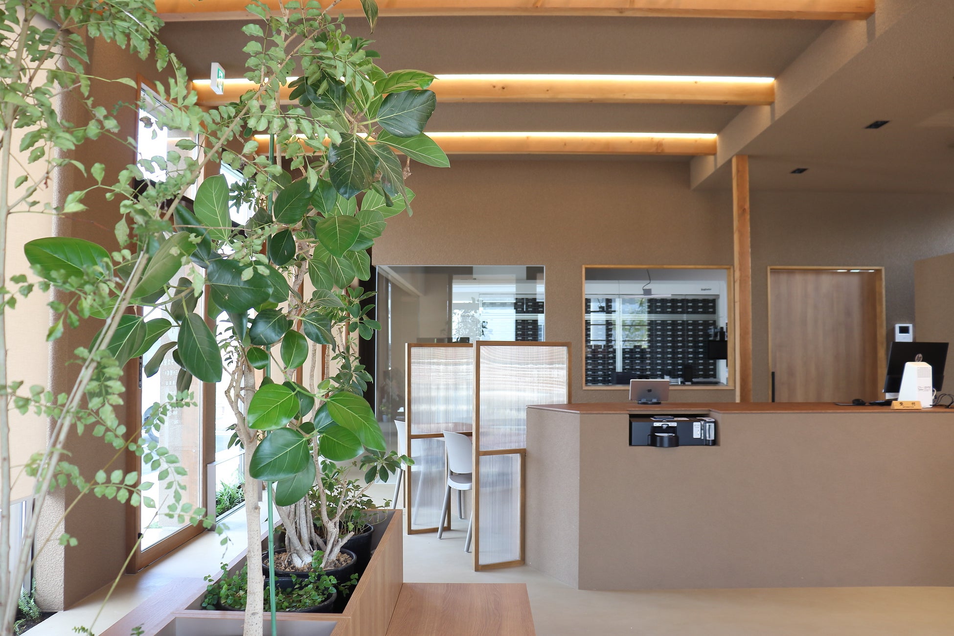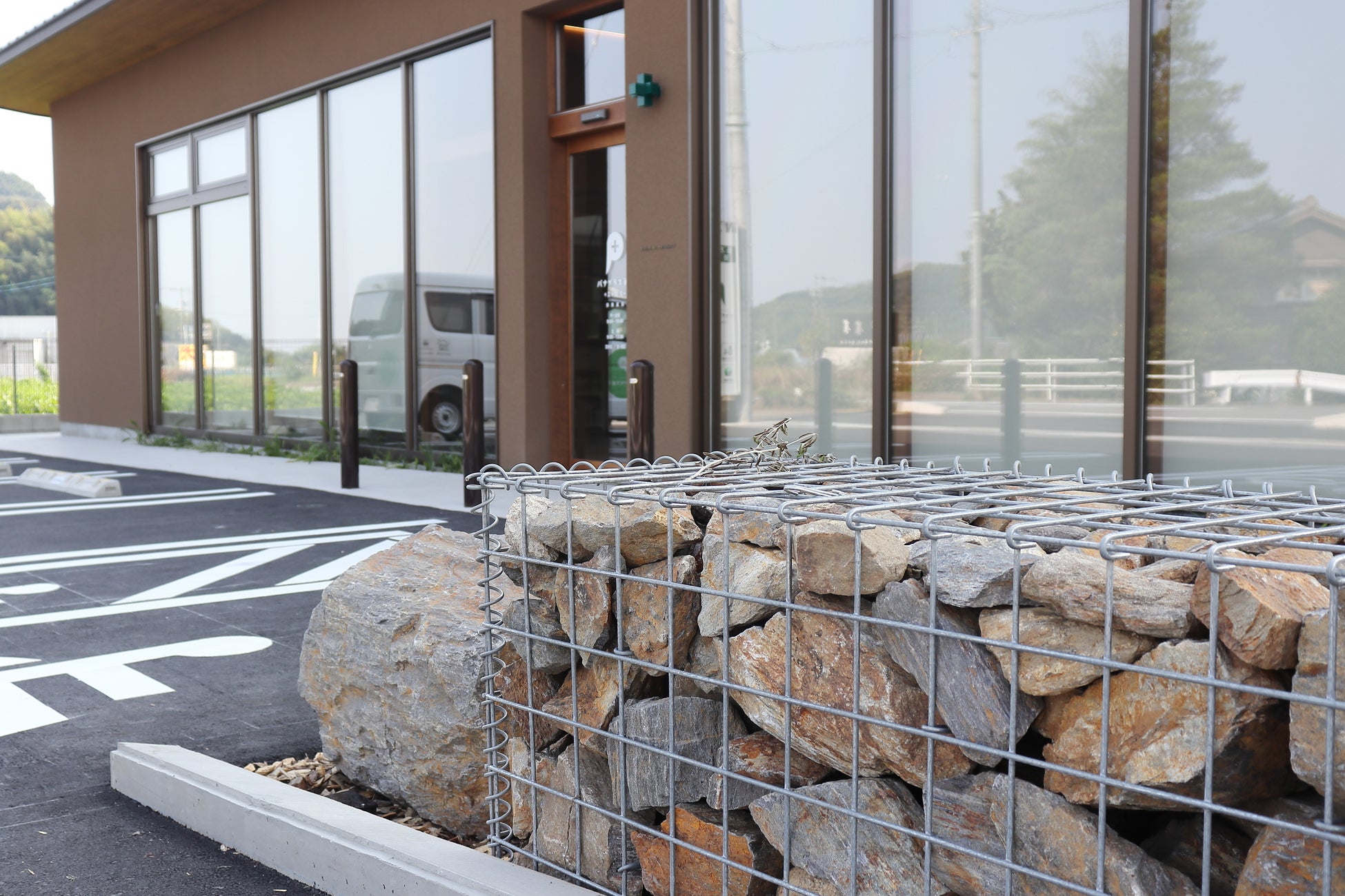 店舗デザインにおいて重視したのは、地域の皆様に愛着を持っていただける空間づくりです。建物には木材を多く使用し、額田郡幸田町の美しい里山風景に溶け込むような色合い・質感を意識。土色の壁と店内外に広がる豊富な植栽で、幸田町の豊かな自然を表現しました。建物を囲う蛇籠に地域材を使用するなど、地域の方に馴染みを持っていただける工夫を随所に凝らしております。