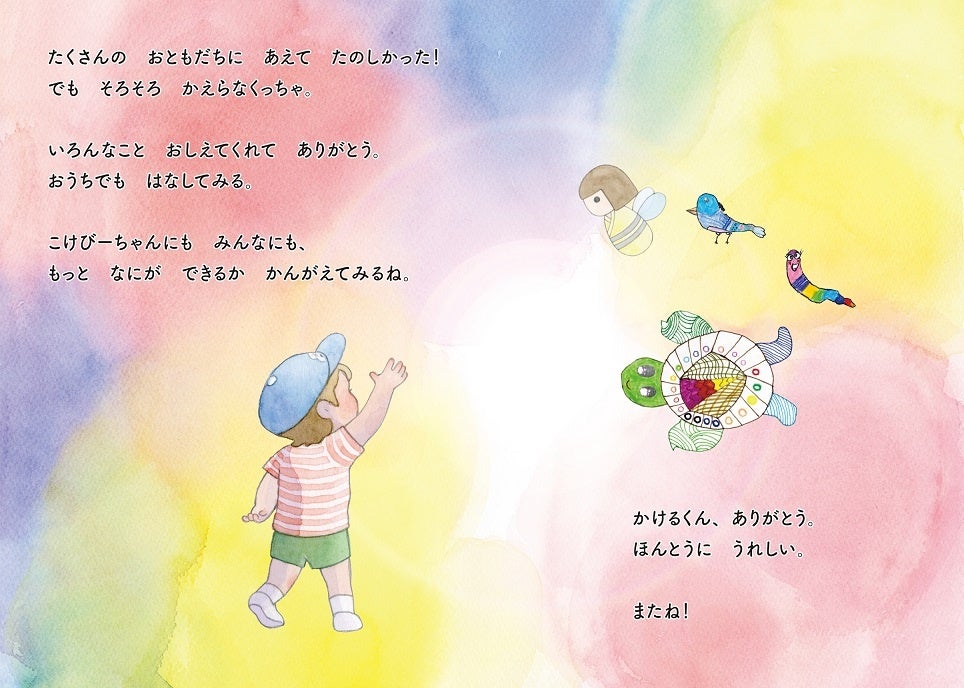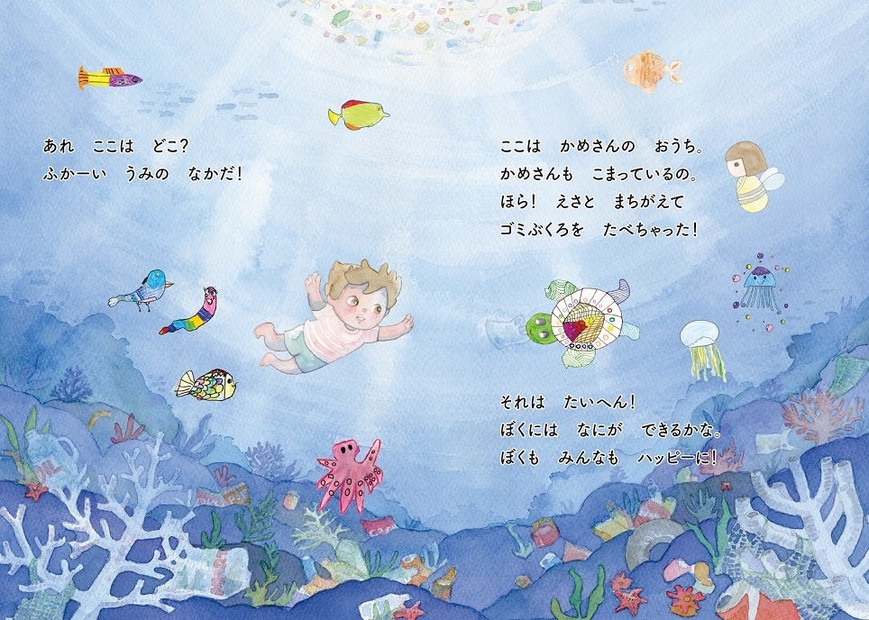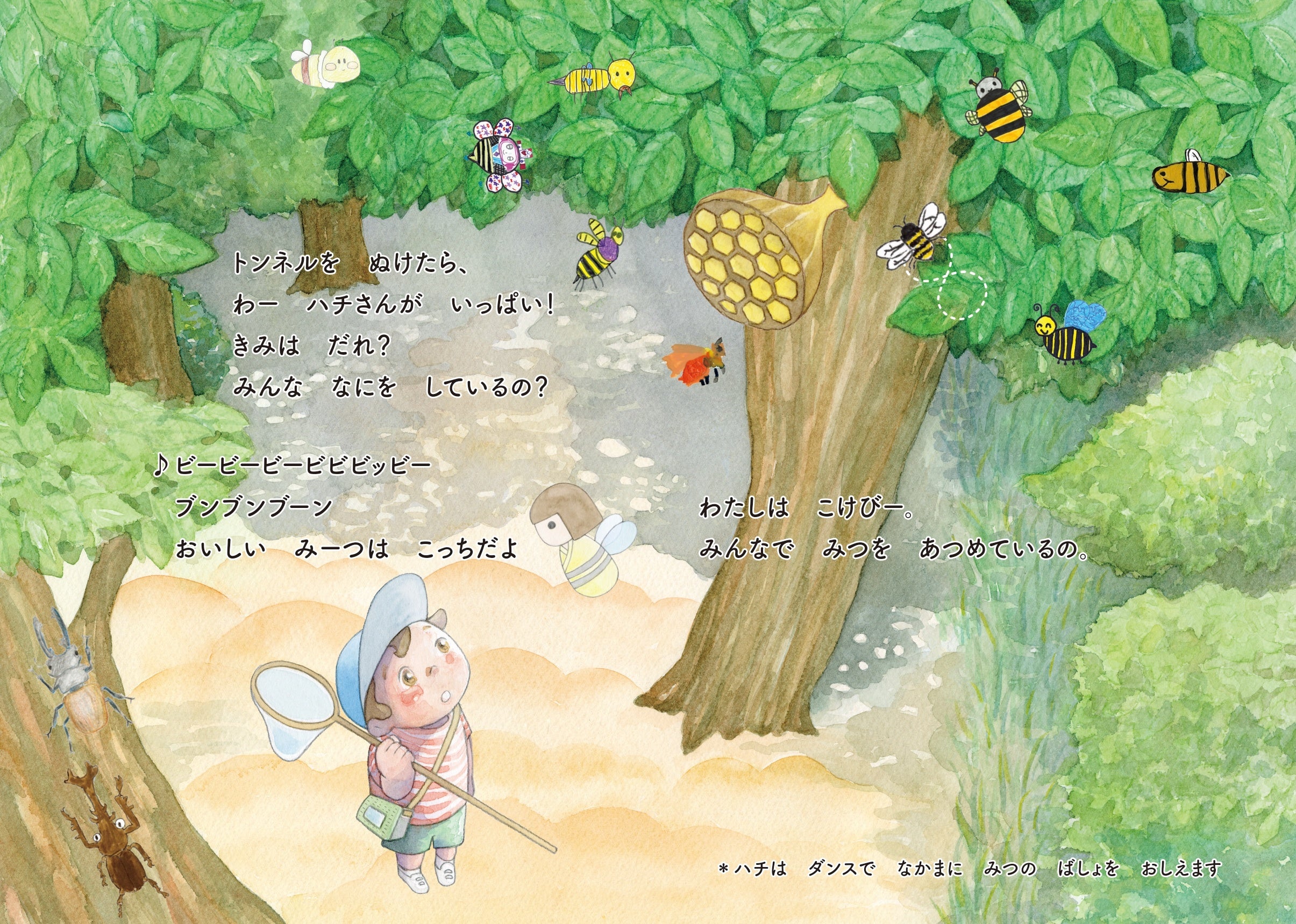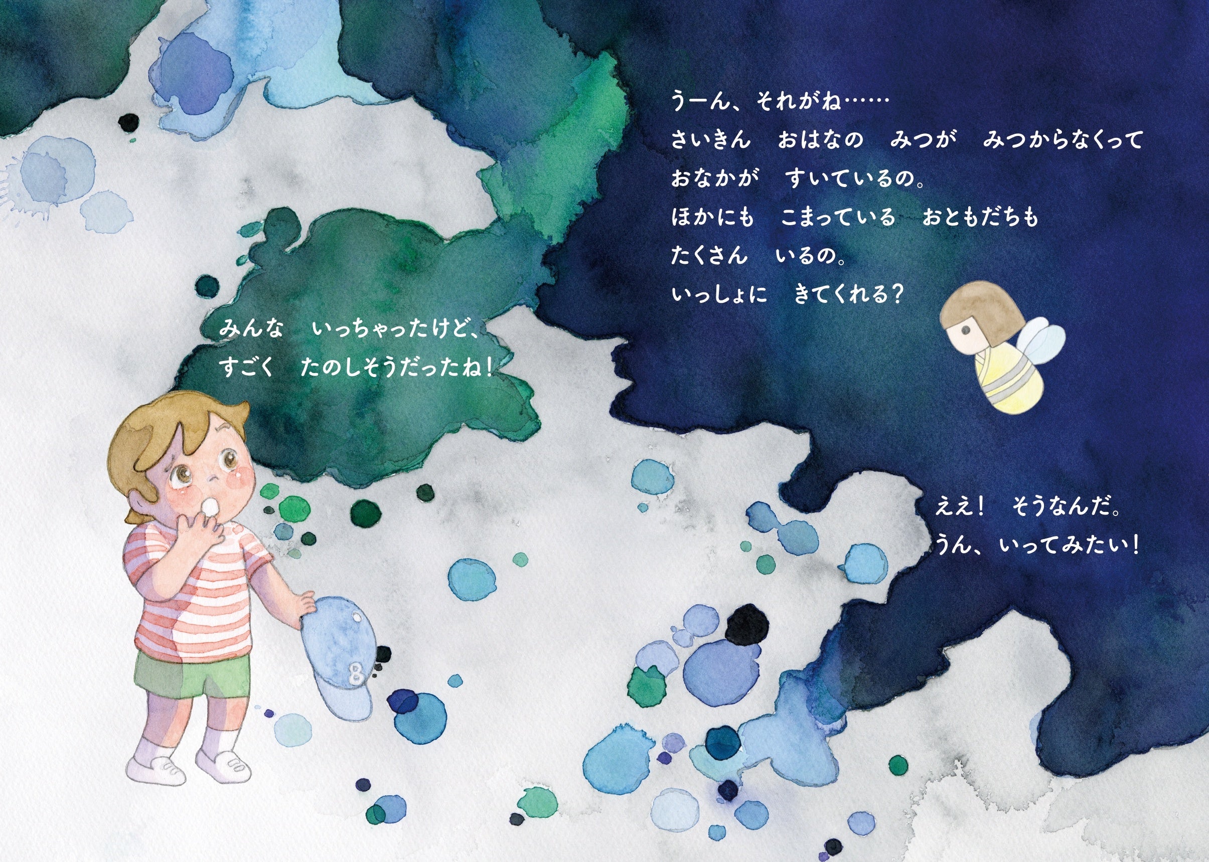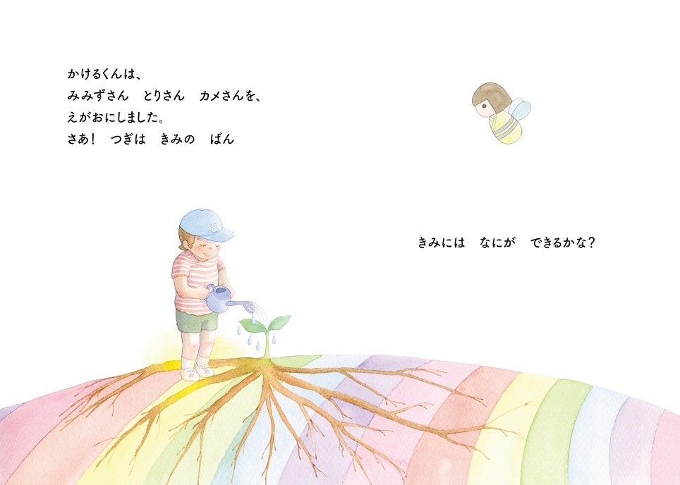 絵本のタイトルは、「きみには なにができるかな」。物語は、主人公の男の子が一匹のミツバチと出会うところから始まります。ミツバチたちが楽しそうに蜜を集めていると思っていたら……「ん?なんだか様子がおかしいみたい。困っているのかな」。その後ミツバチと旅に出た男の子は、困っているのは実はミツバチだけではなく、森の中にいる動物や海の生き物たちも、みんな問題を抱えていることを知ります。自分たちの毎日の暮らしが、実はいろいろな問題にもつながることがわかりました。さまざまな環境問題を知った男の子は、これからどんな行動をとるのでしょうか?