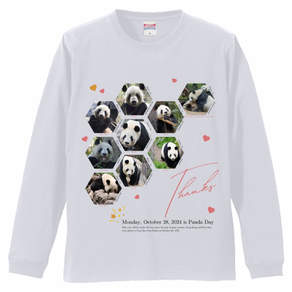 これからの季節に大活躍する少し生地厚めのリブ付き長袖Tシャツ。シャツ前面いっぱいに上野動物園歴代パンダたちの写真をベースにした共通デザインを配し、後ろ襟下には「パンダ ズキューーーン!」のロゴ付き。