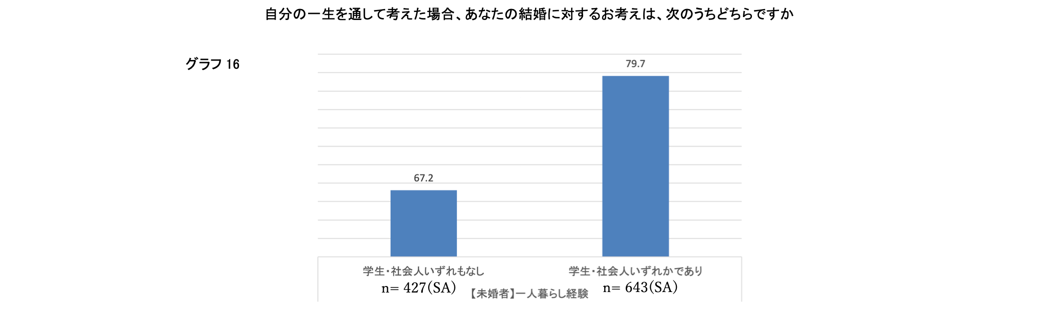 一人暮らしの経験が「学生・社会人いずれかであり」の人の結婚意向〈グラフ16〉は、79.7%となっており、一人暮らし未経験の人(67.2%)に比べて12.5ポイント高い結果となった。