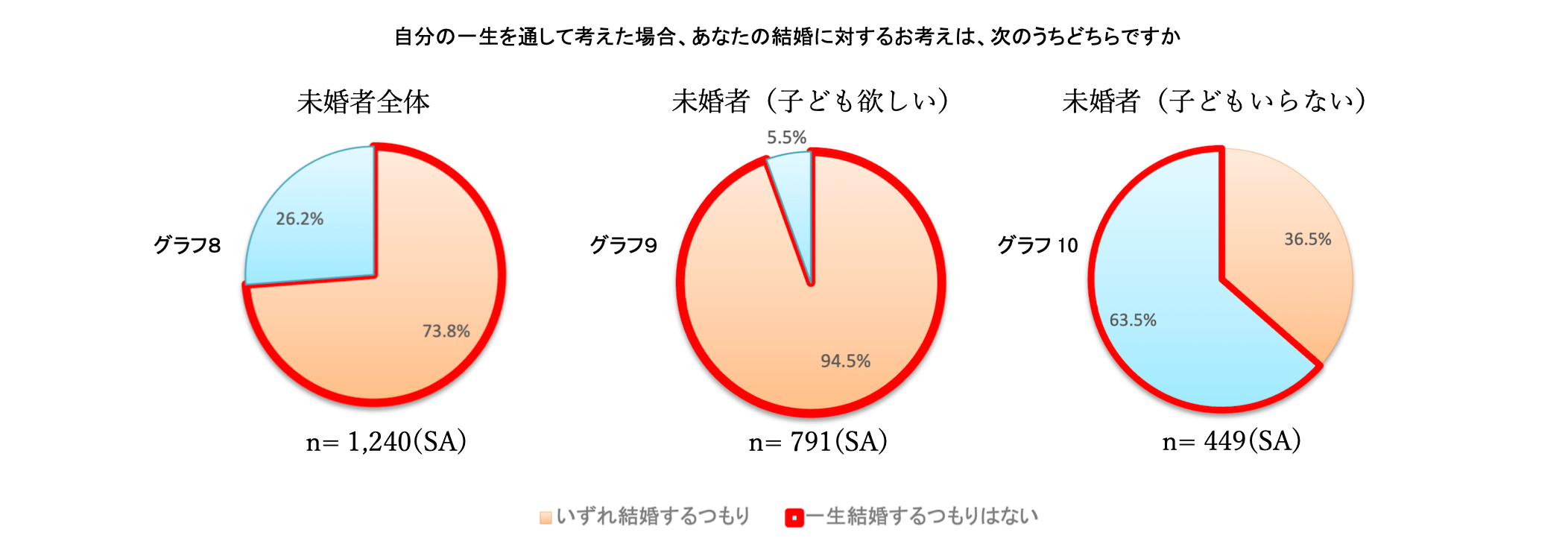 また、本調査を通じて、子どもを欲しいと考えている人の結婚意向が高いことが分かりました。日本は婚外子の割合が非常に低いことから、自分の事として考えた場合、子どもを持つことと結婚することは密接な関係にあると考えられます。