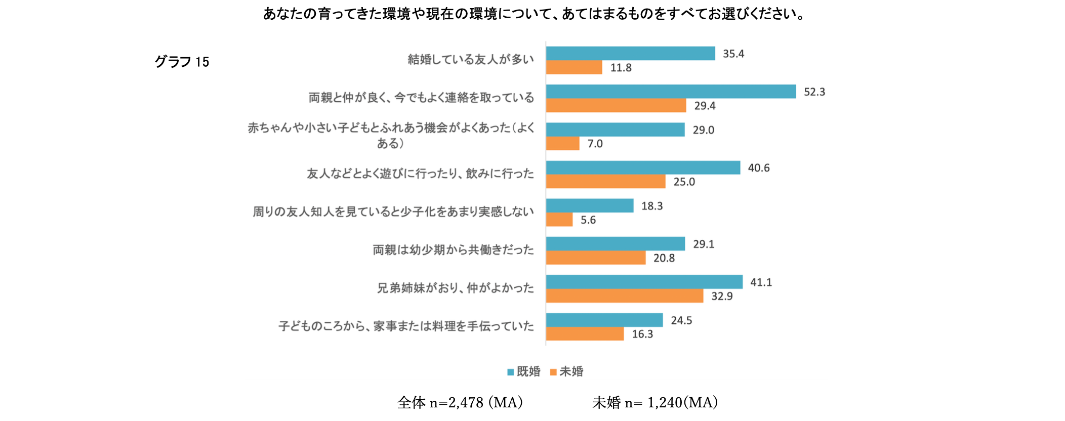 既婚者と未婚者に対し「育ってきた環境や現在の環境」について聞いた結果〈グラフ15〉について、未婚者と既婚者の経験で差異が大きかった回答を見てみると、トップが「結婚している友人が多い」(23.6ポイント差)、2位が「両親と仲が良く、今でもよく連絡を取っている」(22.9ポイント差)、3位が「赤ちゃんや小さい子どもとふれあう機会がよくあった(よくある)」(22.0ポイント差)となり、過去や現在において、既婚者の方が結婚や家族がより身近な環境にいることが分かった。