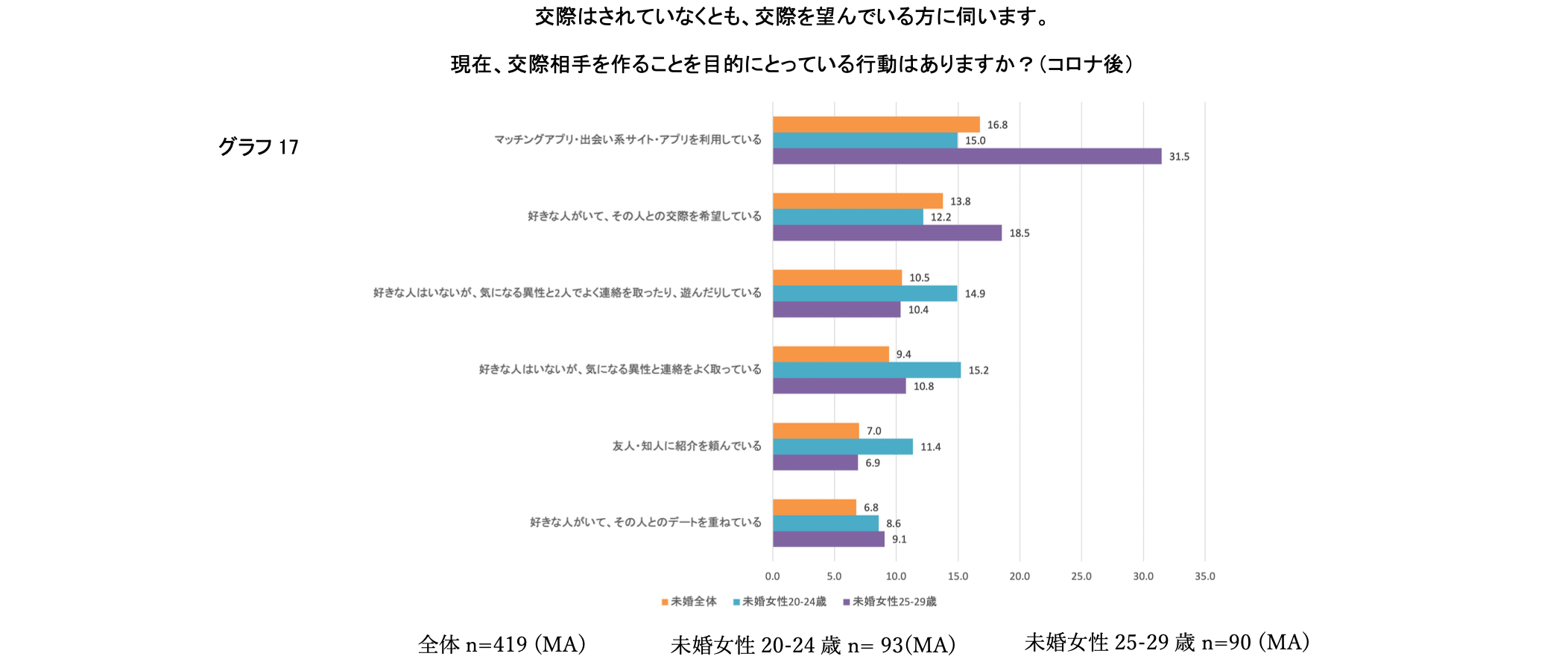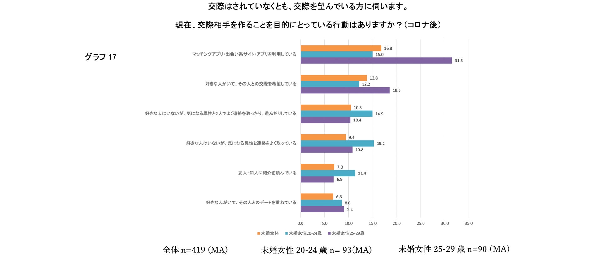 現在交際相手がおらず、交際を希望している人にコロナ後(アフターコロナ)に「交際相手を探すためにとっている行動」について聞いたところ〈グラフ17〉、「マッチングアプリ・出会い系サイト・アプリを利用している」(16.8%)でトップとなり、次に「好きな人がいて、その人との交際を希望している」(13.8%)となりました。