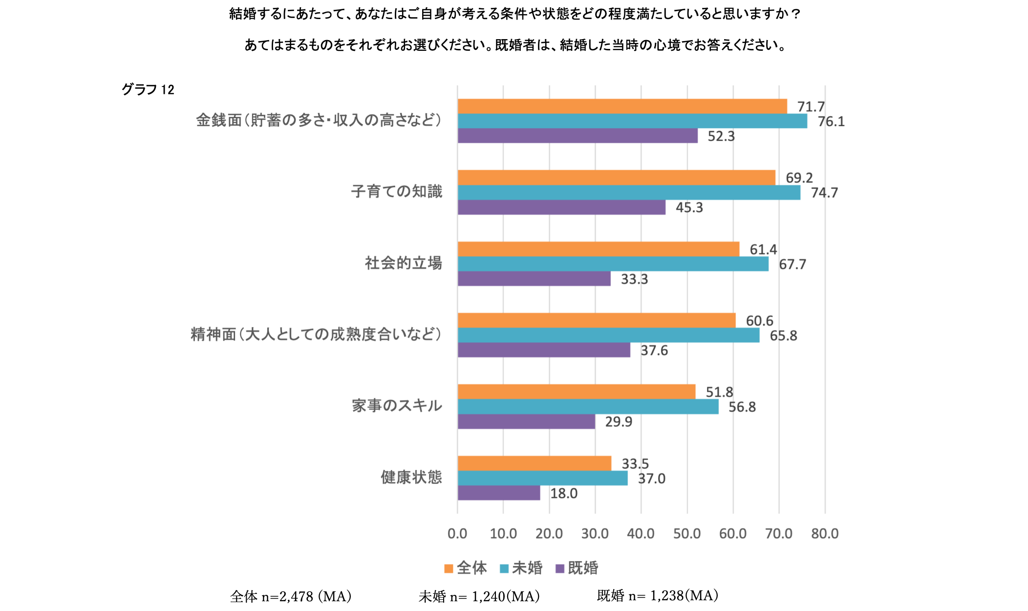 未婚者と既婚者に自分自身が考える条件を満たしているかどうか(既婚者は当時の心境)聞いたところ〈グラフ12〉、金銭面について「満たしていない」(71.7%)がトップとなりました。特に未婚者(76.1%)の割合が既婚者(52.3%)に比べて高くなっています。全体では2位が「子育ての知識」(69.2%)、3位が「社会的立場」(61.4%)となっています。実質賃金が上がらず、非正規雇用の割合が高いことなどを背景に、金銭面や社会的立場から結婚に対する自己評価を低く感じている人の割合が高いことが分かった。