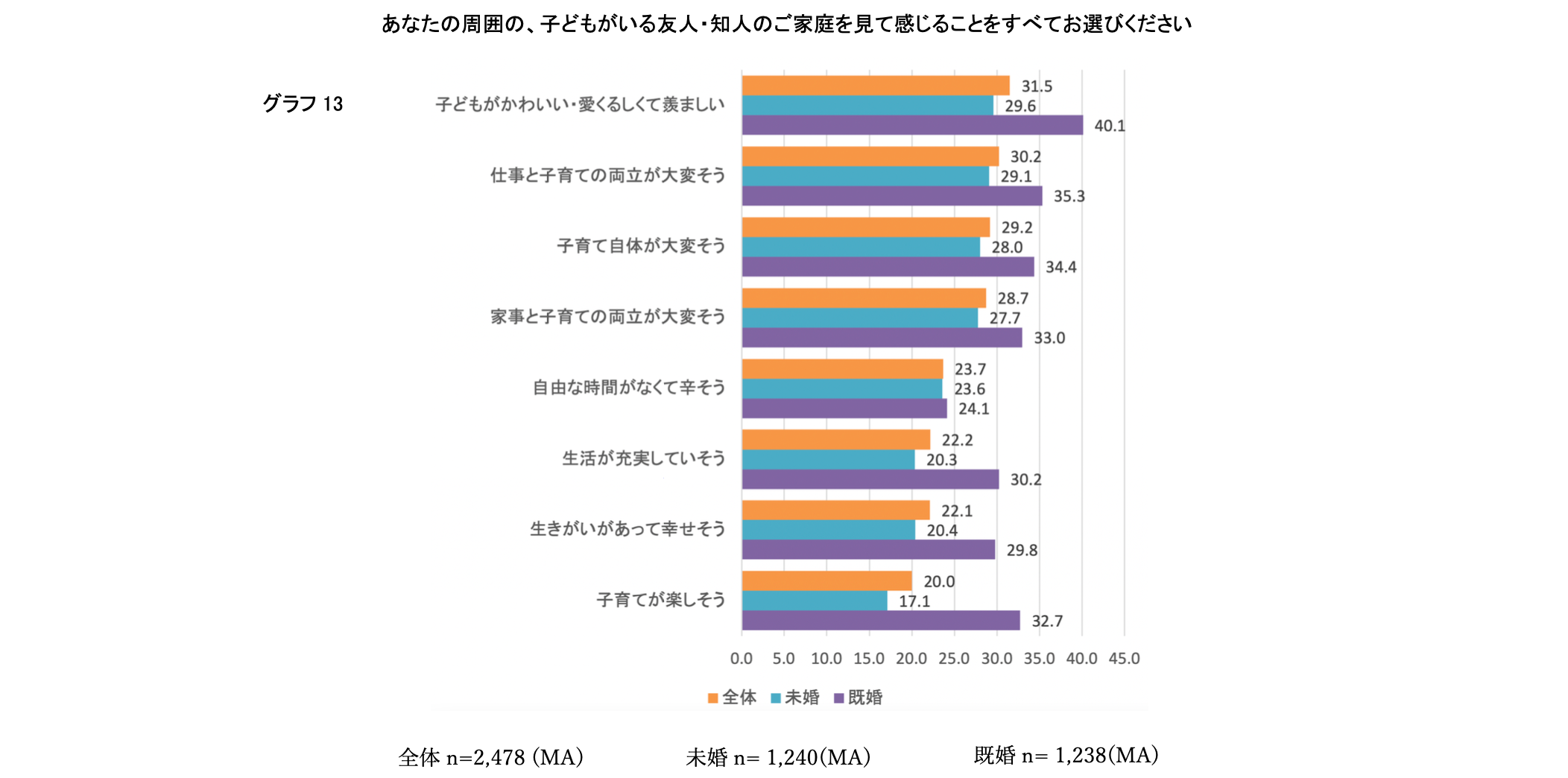 子育てに関する厳しい環境がSNSなどで情報発信されている中、周囲の子育て中の家庭に対する印象を聞いてみました〈グラフ13〉。全体では「子どもがかわいい・愛くるしくて羨ましい」(31.5%)とポジティブな印象がトップとなりましたが、2位が「仕事と子育ての両立が大変そう」(30.2%)、3位が「子育て自体が大変そう」(29.2%)となり、ネガティブな印象が続く結果となりました。