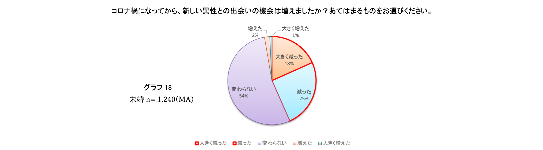 コロナ禍が長期化する中、出会いの機会の変化について聞きました〈グラフ18〉。「コロナ禍になってから、新しい異性との出会いの機会は増えましたか?」との質問に対し、「減った」という人の割合が43.4%となり、「増えた」と回答した人の2.7%を大きく上回りました。コロナ禍の長期化によって、結婚に結びつく出会いの機会が大きく減少したことが分かりました。