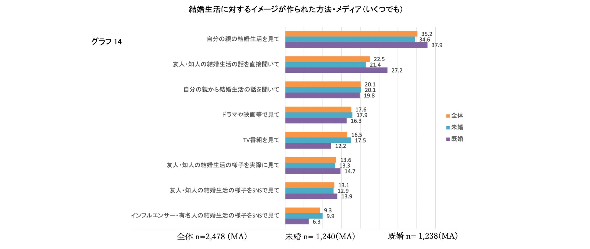 SNSなど日々多くの情報に触れる中、20代の男女は何から結婚に対するイメージを得ているのでしょうか。未婚者と既婚者に対し、「結婚生活に対するイメージが作られた方法・メディア」について聞いたところ〈グラフ14〉、トップは「自分の親の結婚生活を見て」(35.2%)で、2位は「友人・知人の結婚生活の話を直接聞いて」(22.5%)となりました。一方、「インフルエンサー・有名人の結婚生活の様子をSNSで見て」は9.3%となっており、多くの20代がSNSを活用する中、結婚に関する印象は身近な両親や友人から影響を受けていることが分かりました。
