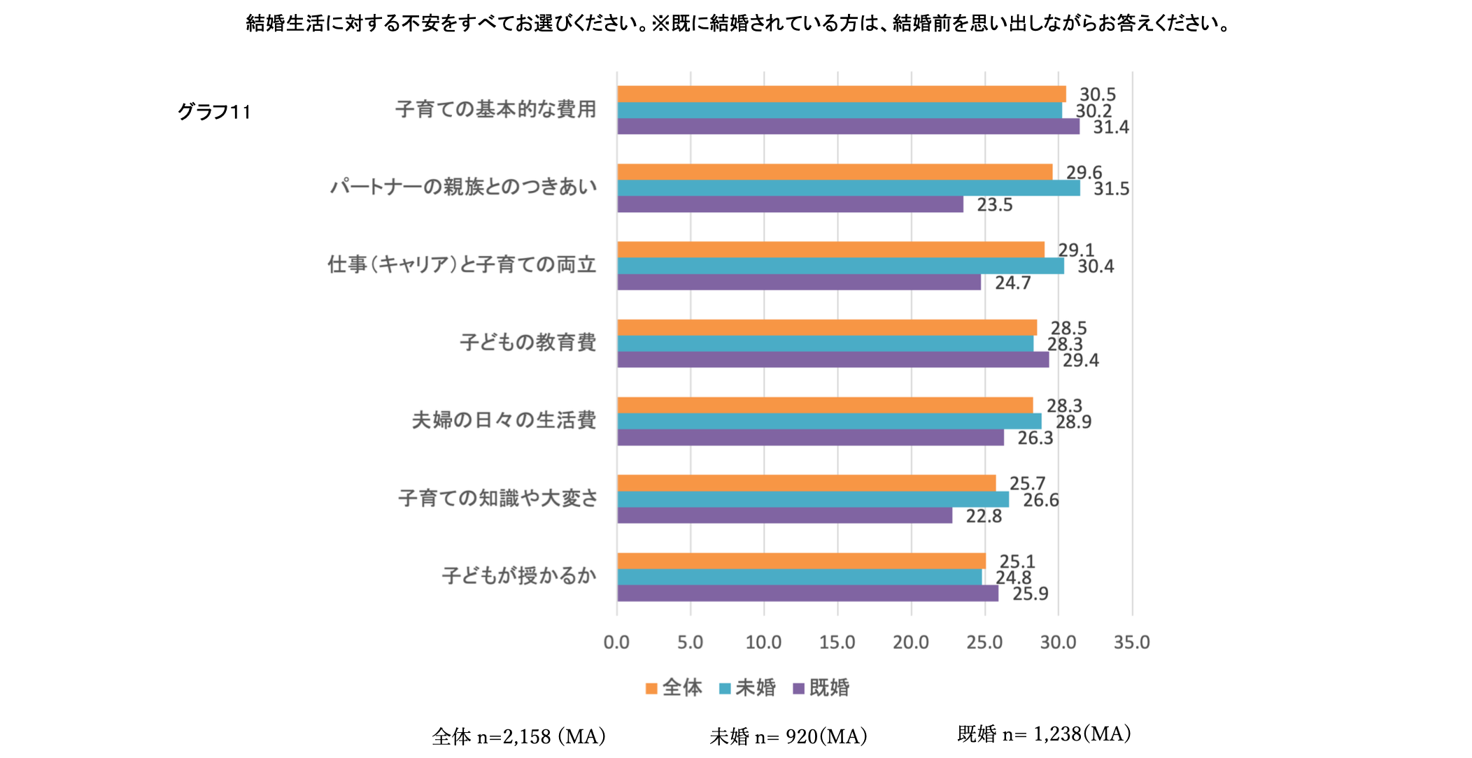 未婚者と既婚者に結婚に対する不安(既婚者は結婚前の気持ち)を聞いたところ〈グラフ11〉、全体では「子育ての基本的な費用」(30.5%)がトップとなった。続いて、「パートナーの親族との付き合い」(29.6%)、「仕事と子育ての両立」(29.1%)と続いた。未既婚別のトップは、未婚者が「パートナーの親族との付き合い」(31.5%)、既婚者が「子育ての基本的な費用」(31.4%)という結果だった。金銭面に加え、義理の両親などとの付き合い方や関係性に不安を感じている人が多いことが分かりました。