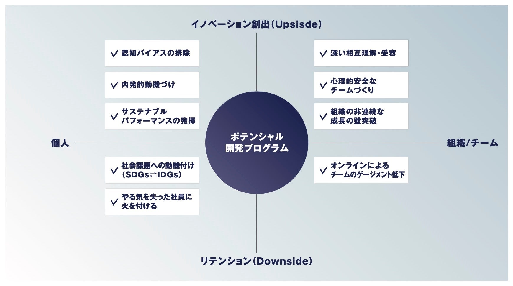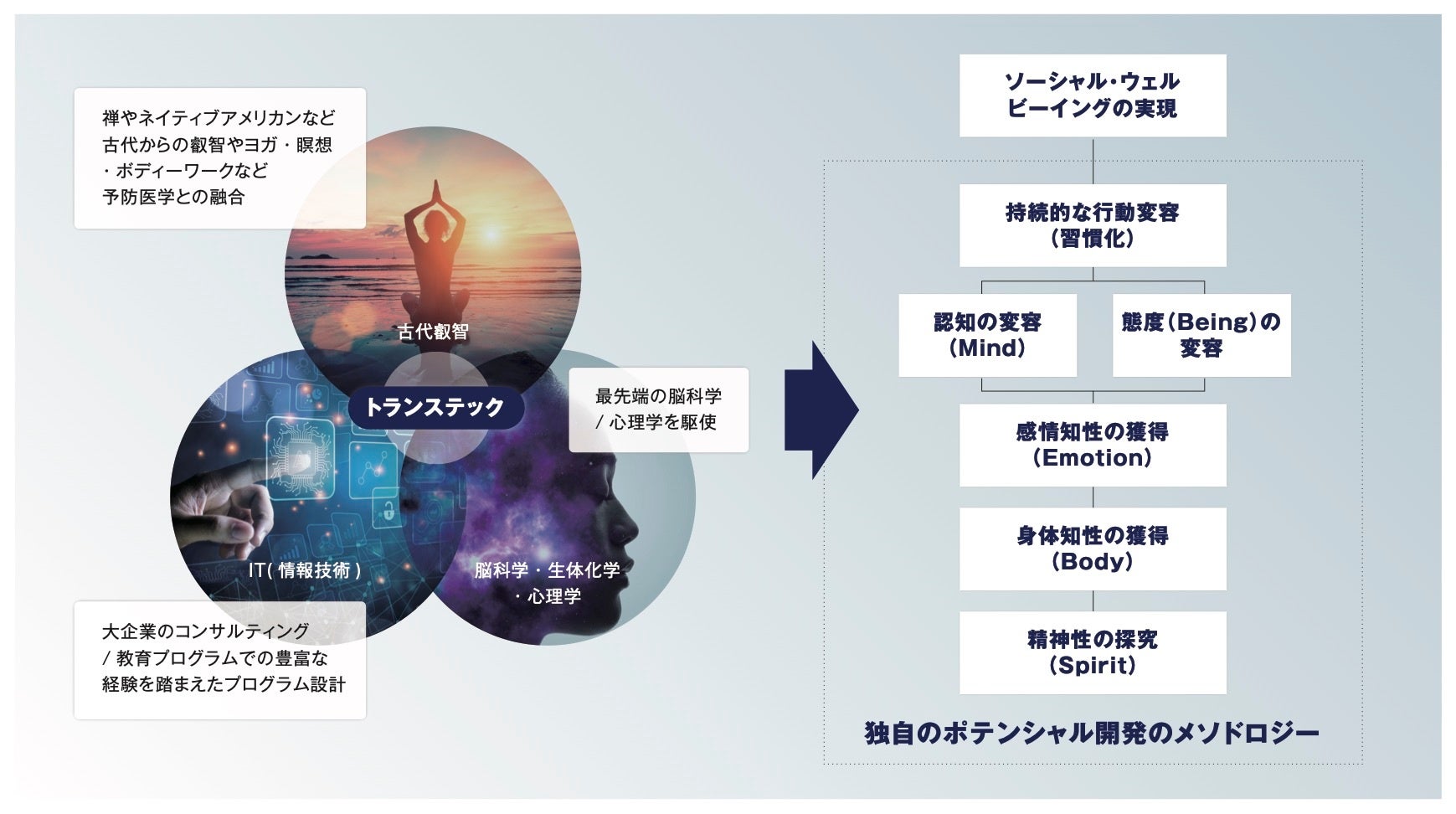最新の脳科学、認知科学、生体科学、古代叡智に基づく、マインド、感情、身体、精神、意識領域から無意識領域までを統合的に開発するプログラムです。個人が真の内発的動機を見出すことで、マインドが変わり、態度変容し、継続的な行動が変わる。個人の自律と組織の心理的安全性を同時に育み、個人と組織のウェルビーイングを高いベルで統合するアプローチです。