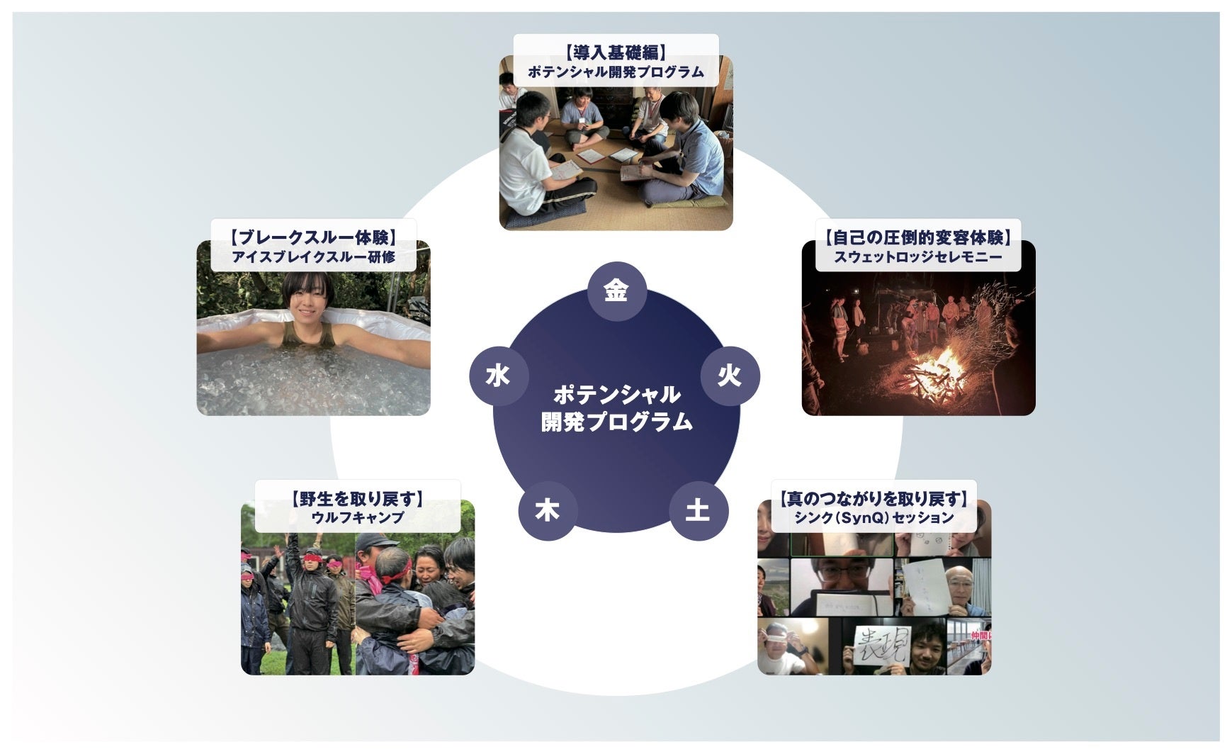 上記では、イノベーター向け変容プログラム「アイスブレイクスルー研修プログラム」(1DAY)をご提案しておりますが、それ以外にも様々なエレメントからポテンシャルを開発する研修プログラムをご用意しております。御社の課題や受容度に応じて様々なメニューをご提案させていただきます。