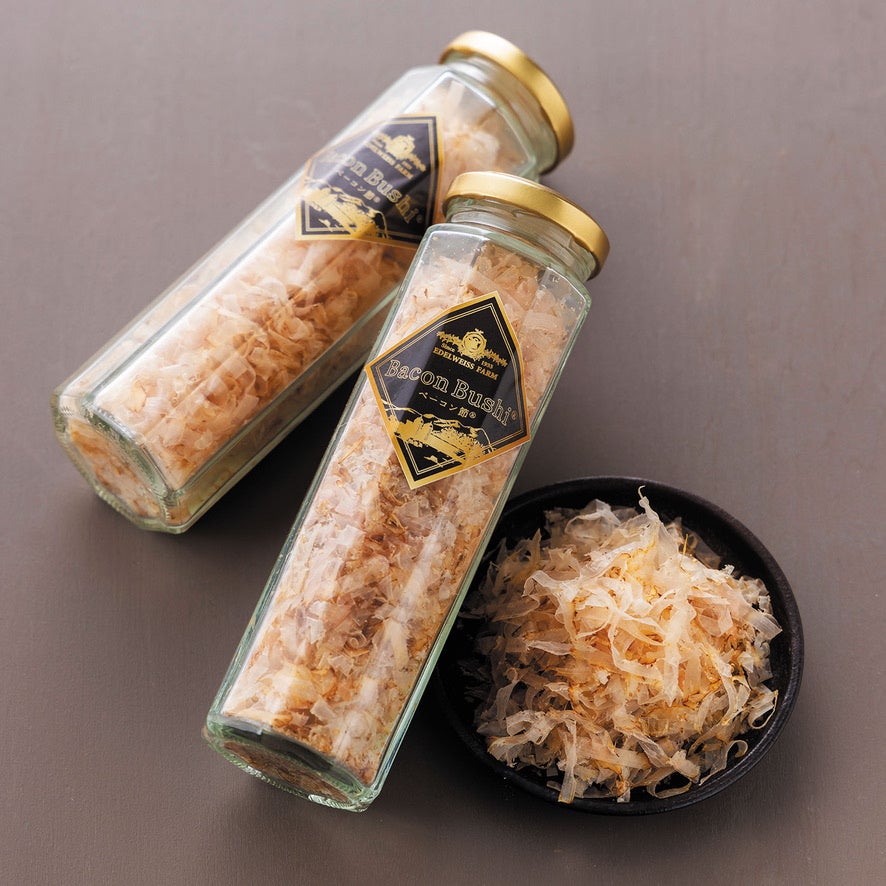 「ベーコン節®」は、エーデルワイスファームのオリジナル商品であります。、北海道産の豚肉を使用し、長期間の氷温熟成を経て、じっくりと焙乾させた後、4ヶ月以上の時間をかけ熟成させた逸品です。かつお節のように削って使用することで、料理のトッピングとして深い風味と旨味を加えることができ、料理の新しい楽しみ方を提案する商品です。10kgの原料から僅か2kg程度の製品しか出来上がりません。
